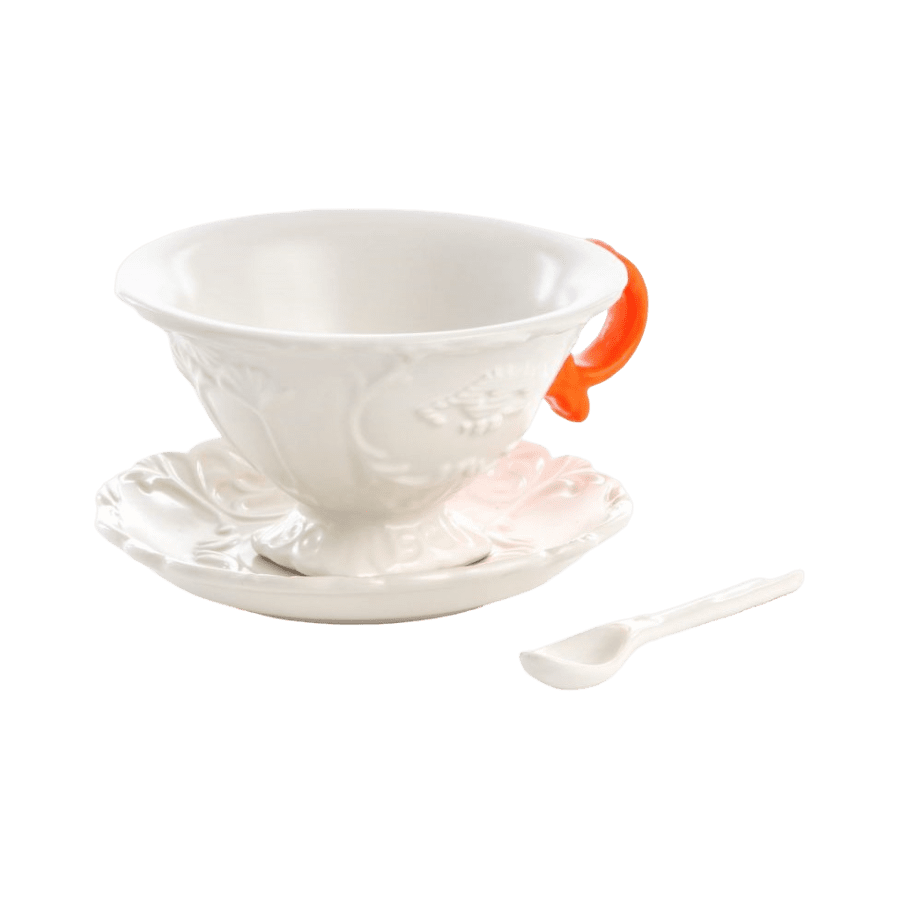 Smalks, necaurspīdīgs porcelāns ar matēti baltu apdari un fluorescējošas krāsas rokturiem.