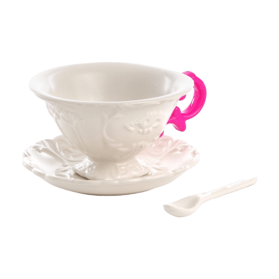 Smalks, necaurspīdīgs porcelāns ar matēti baltu apdari un fluorescējošas krāsas rokturiem.