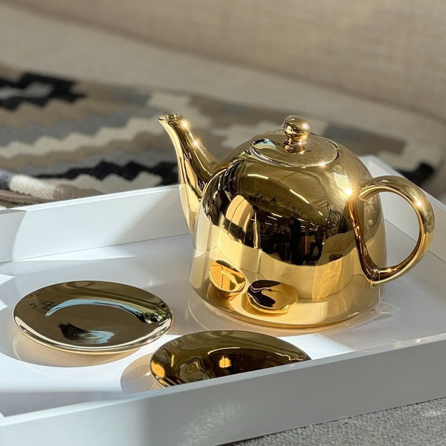 Tējkanna Gold – pievienojiet eleganci saviem tējas mirkļiem ar šo grezno zelta krāsas tējkannu no VT Wonen. Tējkanna izgatavota no augstvērtīga porcelāna, kas apvieno izsmalcinātu dizainu ar praktisku lietojamību.