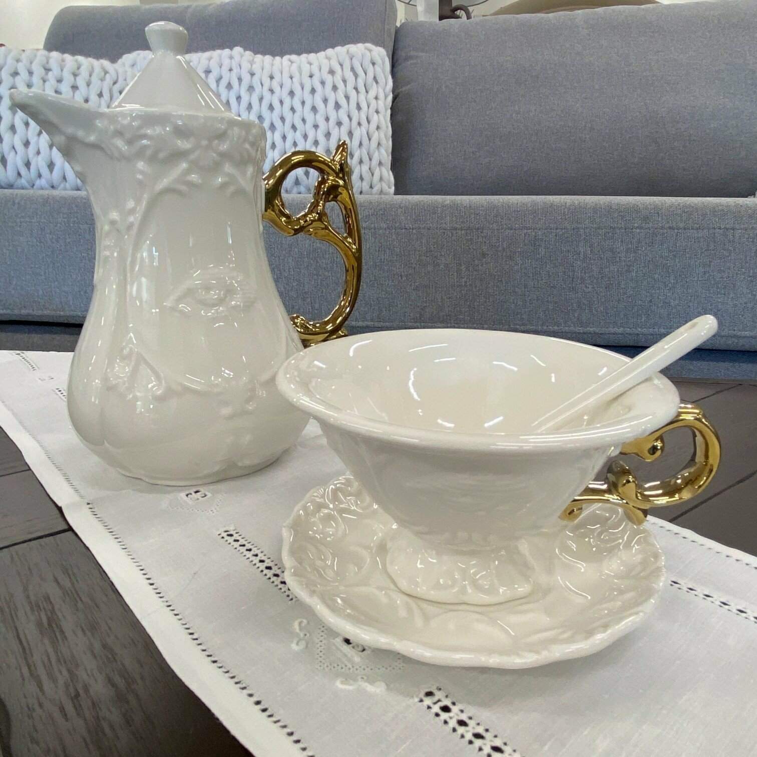 Krūzes, tējas un kafijas komplekti, kas ir baroka stila iedvesmoti.