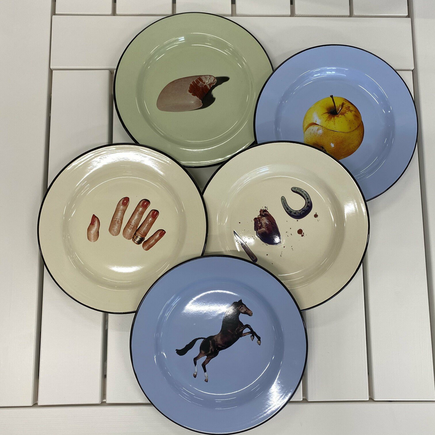 Toiletpaper Home sadarbībā ar Seletti piedāvā ekskluzīvu šķīvju sēriju, ko izstrādājuši Maurizio Cattelan un Pierpaolo Ferrari. “I Love You” šķīvi rotā satraucošs un dramatiski ironisks naža, īstas sirds un pakava tēls pēc kārtas, veidojot mīlestības vēstījumu: “i ❤ u”. Iedvesmojoties no darbiem, kas publicēti viņu fotožurnālā Toiletpaper, abi mākslinieki piedāvā savus pārsteidzošākos attēlus šai ekskluzīvajai dizaina trauku kolekcijai: šķīvju sēriju, kas izgatavota no viegli emaljēta metāla, kas apvieno sirreālu attēlu neticami izteiksmīgo pievilcību ar sadzīves un ikdienas dimensiju, ko rosina izmantoto materiālu vienkāršība. Izrotājiet savu galdu oriģinālā veidā ar slavenākajām un Toiletpaper grafikām.