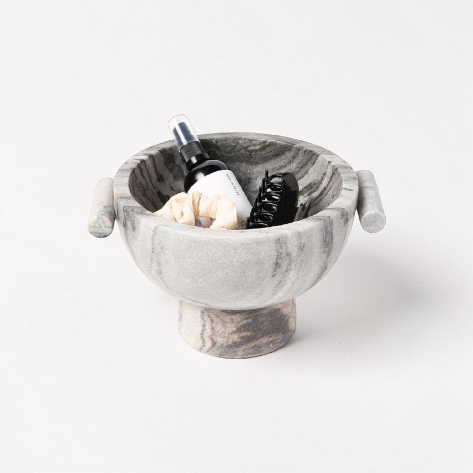 Eleganta un izteiksmīga bļoda, izgatavota no dabīgā marmora. Katrs izstrādājums ir unikāls, pateicoties marmora dabīgajam dzīslainumam un toņu niansēm – no gaiši pelēka līdz tumšākiem akcentiem.