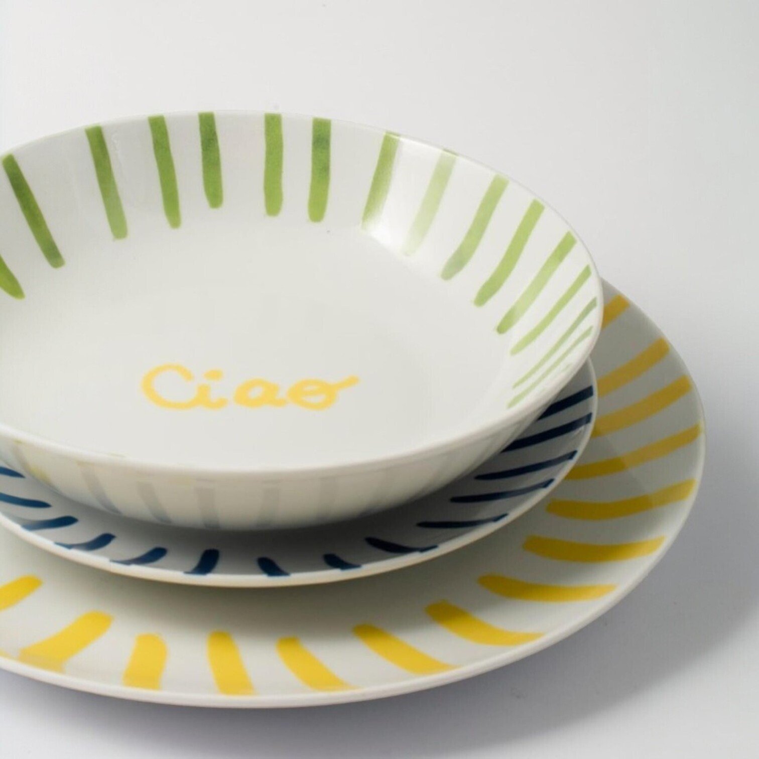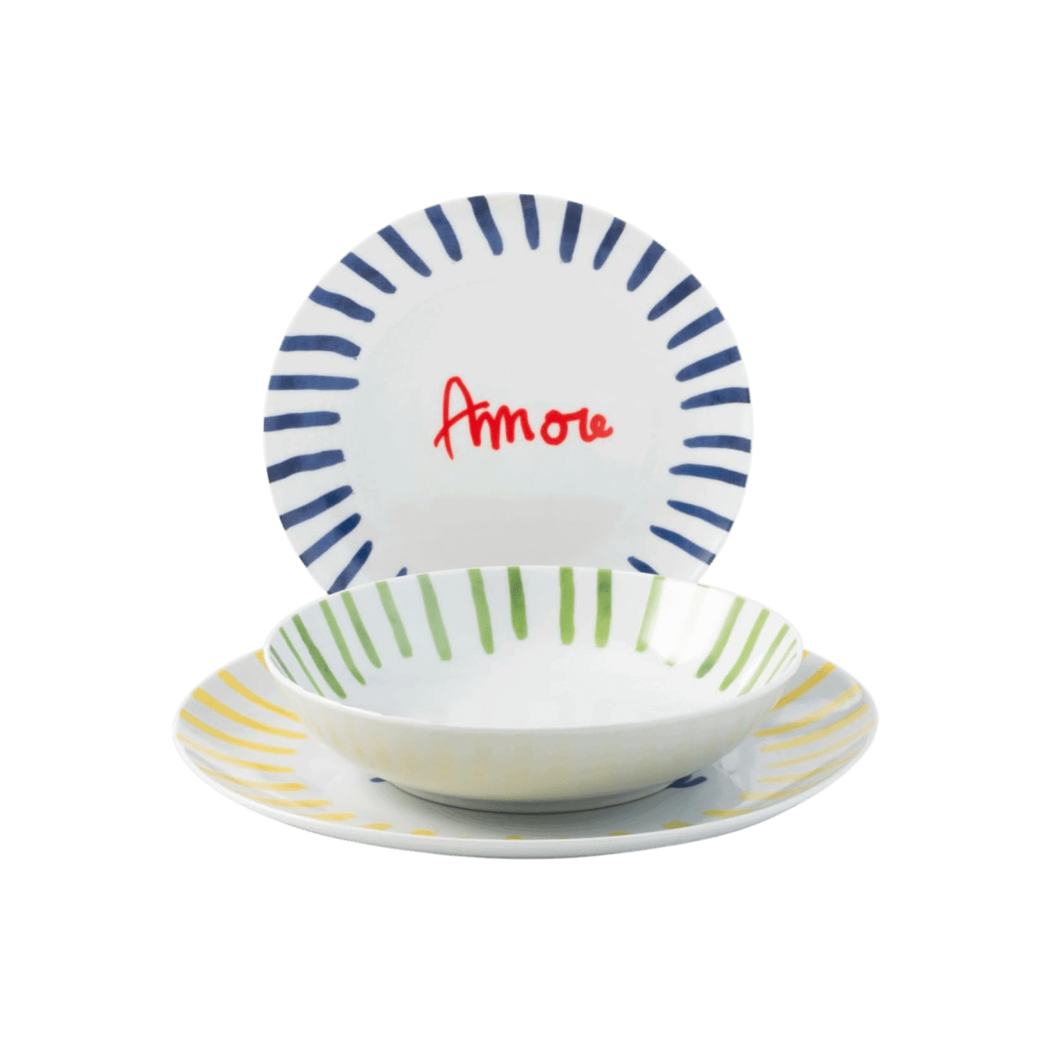 Stilīgs un krāsains porcelāna šķīvju komplekts no H&M, kas piešķirs galda klājumam dzīvīgumu un mūsdienīgu noskaņu. Komplektā ietilpst trīs dažādi šķīvji – vakariņu šķīvis, dziļais šķīvis un uzkodu/deserta šķīvis –, katrs ar savu košu svītru rakstu. Uz viena no šķīvjiem redzams uzraksts “Amore”, kas piešķir dizainam rotaļīgu un siltu akcentu.