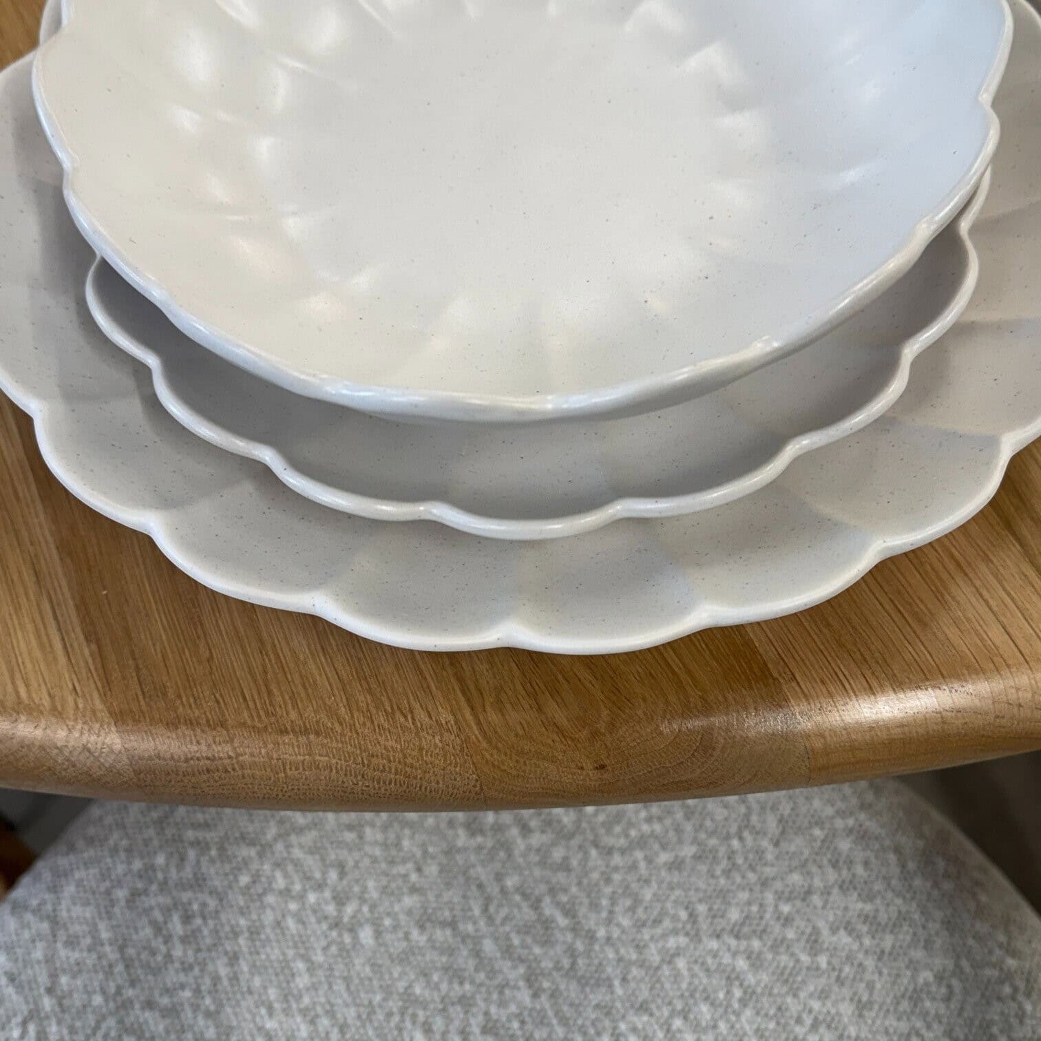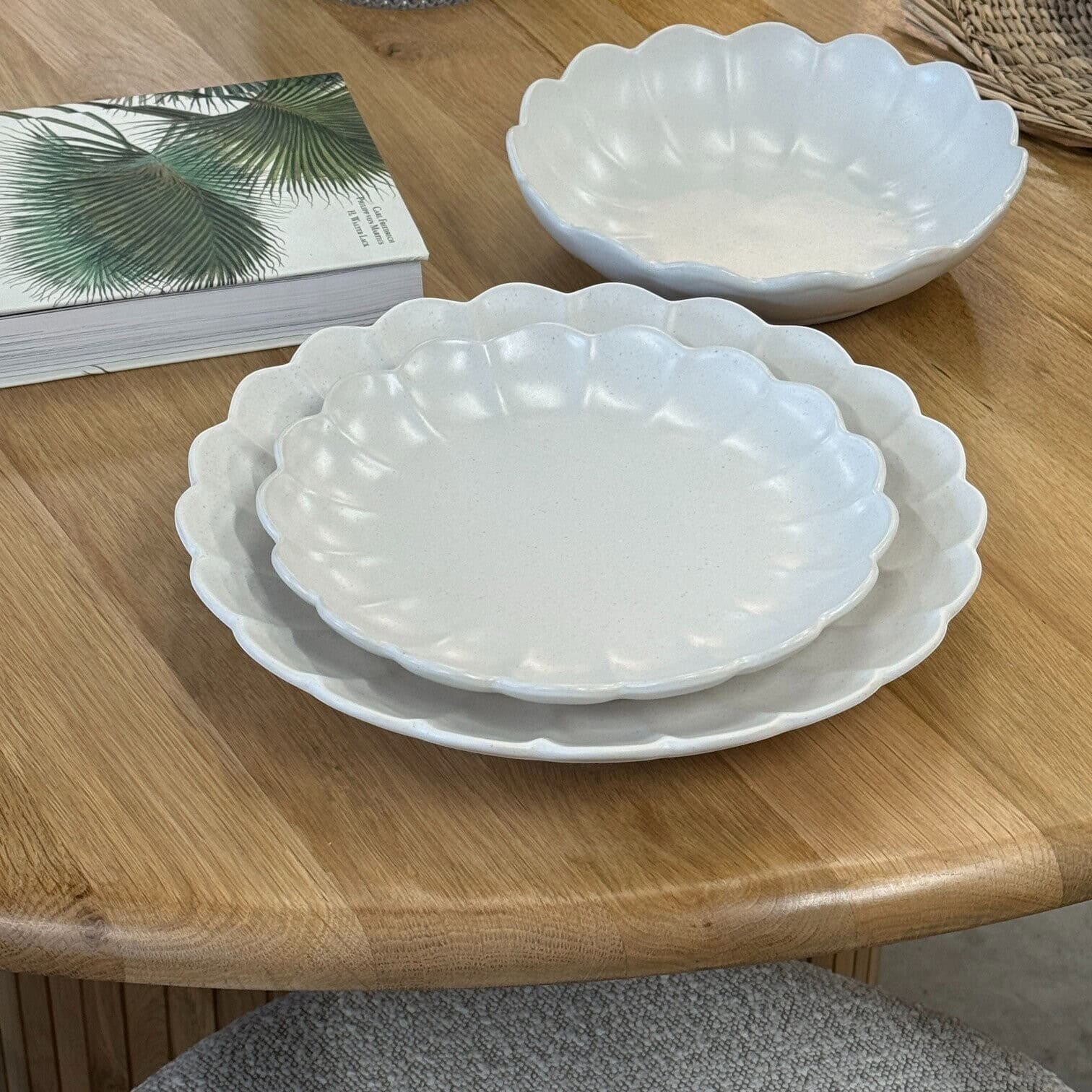 Izsmalcināts un daudzpusīgs trauku komplekts, kas piešķirs galdam elegantu un harmonisku izskatu. Trauki izgatavoti no kvalitatīvas keramikas maigi baltā tonī ar dekoratīvu, viegli viļņotu reljefa malu, kas atgādina ziedlapu formu. Šis smalkais dizains lieliski iederēsies gan ikdienas maltītēs, gan svētku galda klājumā.