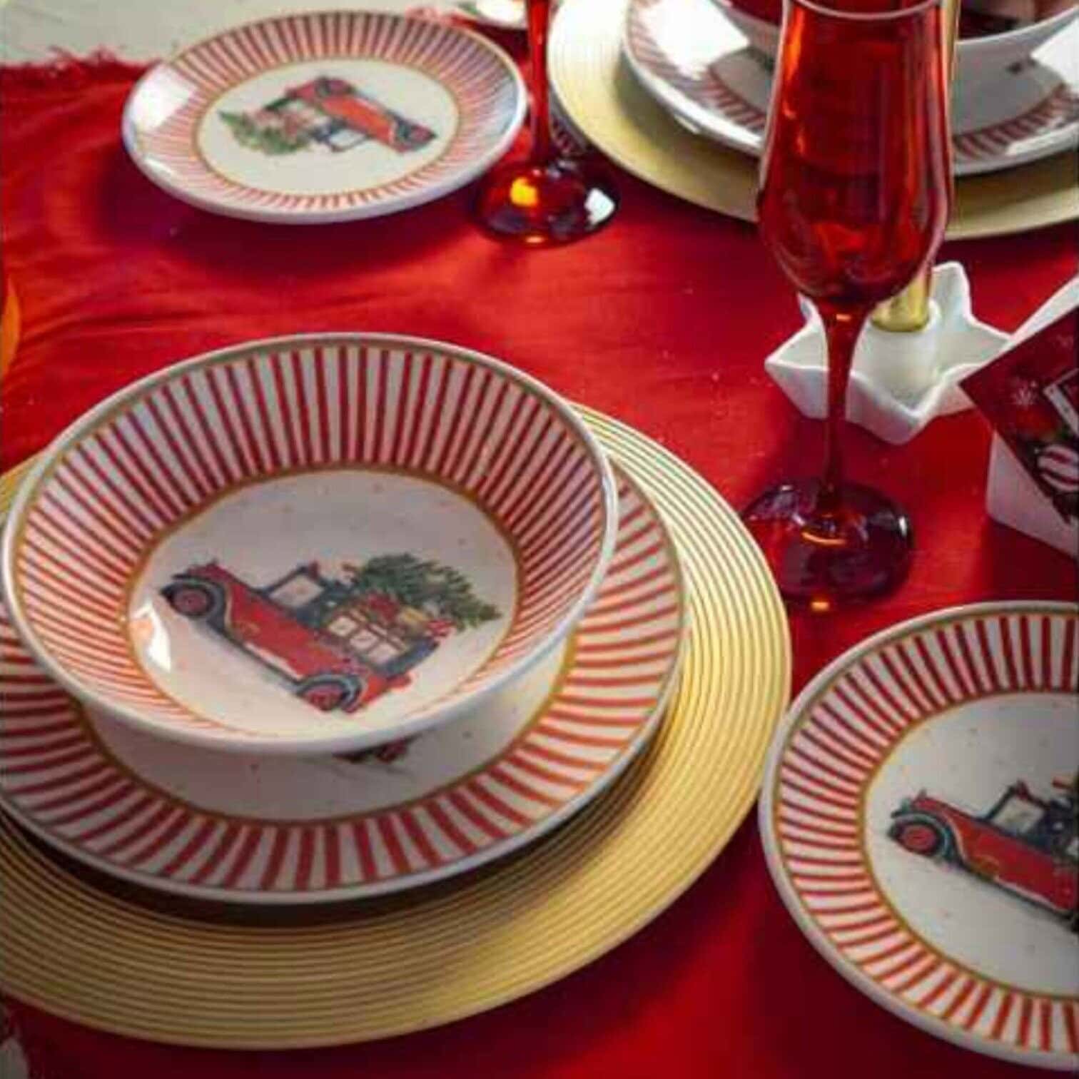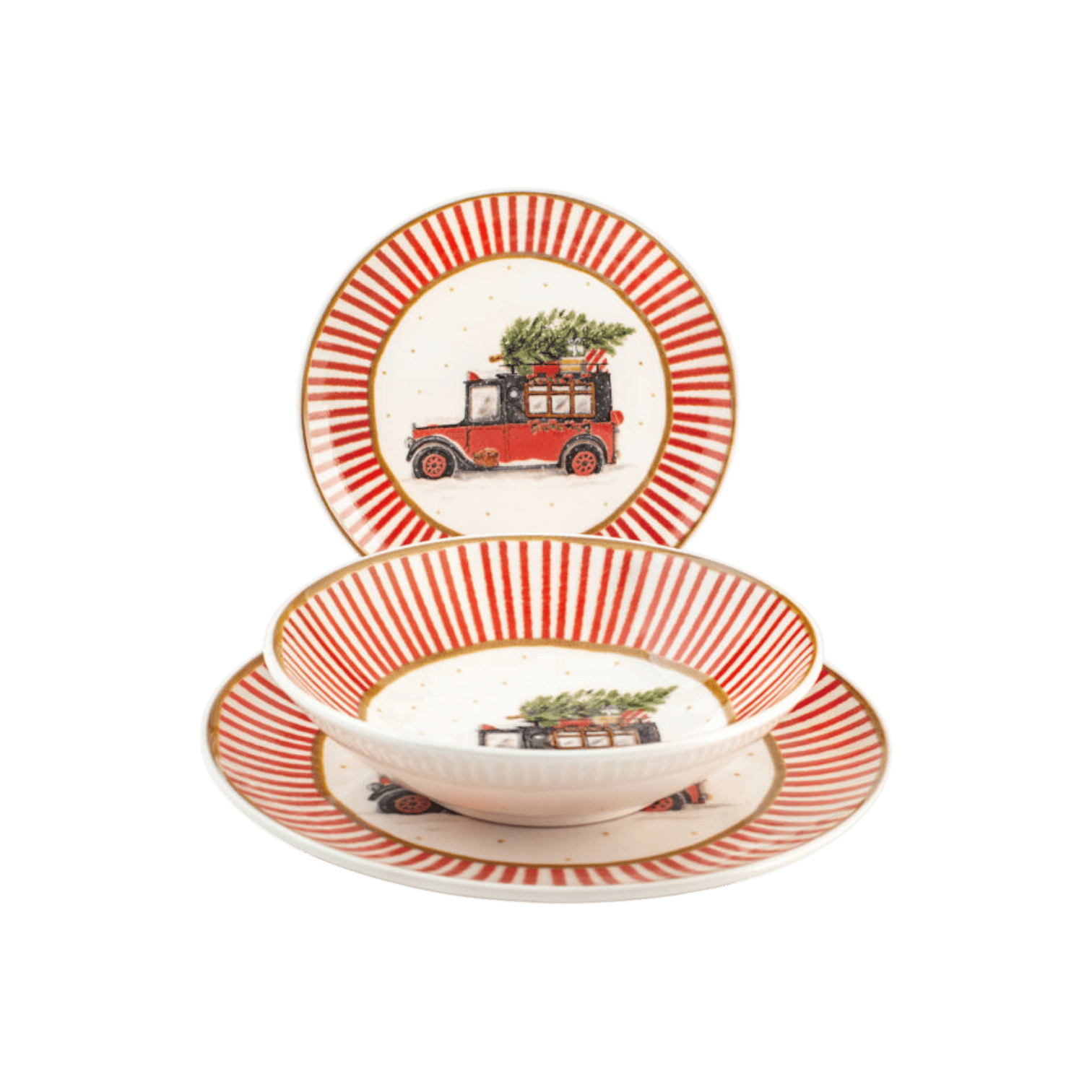 Radiet svētku noskaņu pie pusdienu galda ar burvīgo “Victorian” trauku komplektu! Vintage stila ilustrācijas ar sarkanu auto, kas ved Ziemassvētku egli, kopā ar svinīgām zelta detaļām un košām sarkanām līnijām piešķir traukiem īpašu šarmu un siltumu.