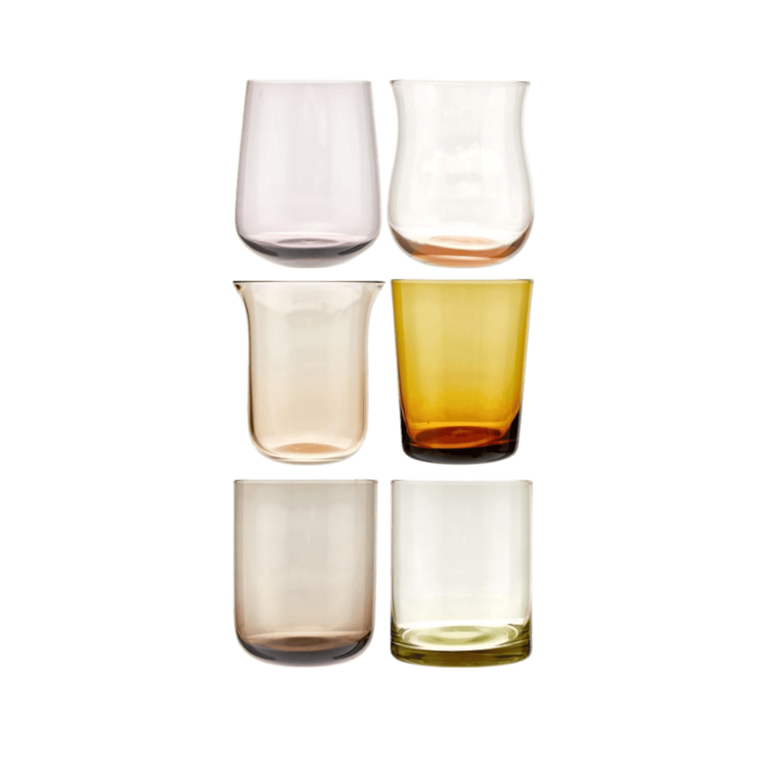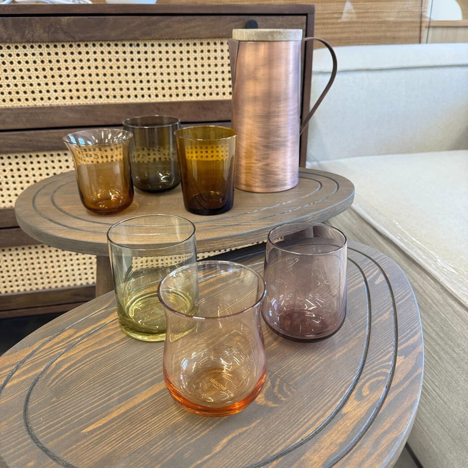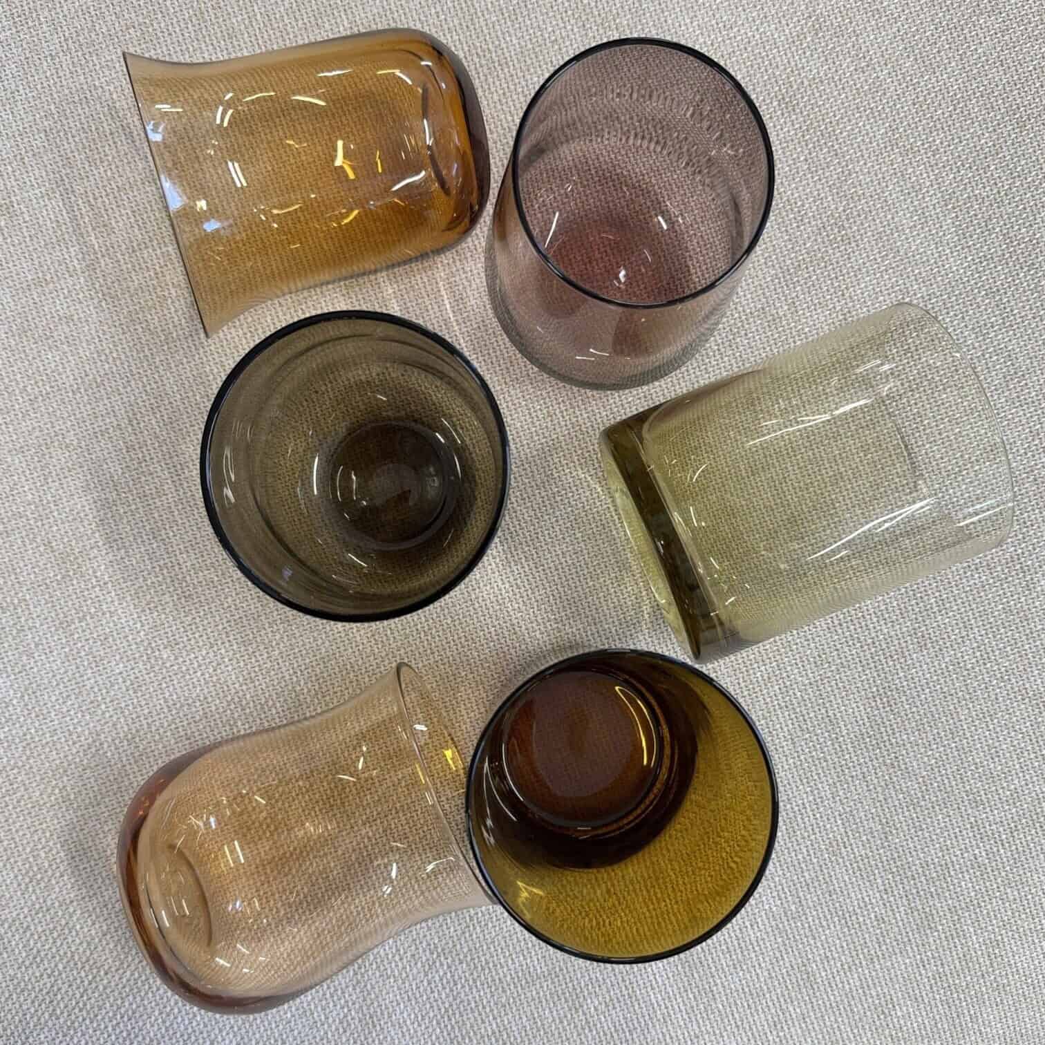 Tās izgatavotas no kvalitatīva, caurspīdīga stikla, kas tonēts maigās, siltās krāsās – gaiši rozā, dzidri oranžīgā, dzeltenā, dzintarbrūnā un zaļganā tonī. Katra glāze ir nedaudz atšķirīga gan formā, gan tonējuma intensitātē, kas norāda uz roku darbu un piešķir katrai no tām unikālu raksturu. Glāzēm ir vienkāršs, minimālistisks siluets – dažas ar nedaudz izliektām malām, citas taisnākas un klasiskākas formas, kas kopumā rada vizuāli harmonisku un mūsdienīgu koptēlu. Šādas glāzes ne tikai praktiski kalpo, bet arī piešķir galdam izsmalcinātu noskaņu.