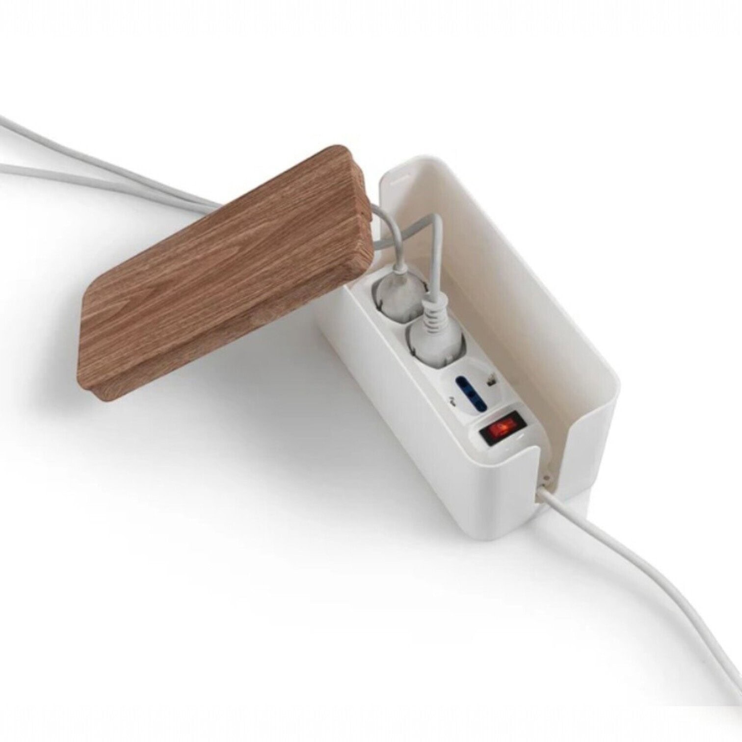 Vadu organizators ir ideāls risinājums, lai paslēptu pagarinātāju un liekos vadus, radot tīru un estētisku vidi. Baltā korpusa un koka vāka kombinācija piešķir modernu dizainu, kas iederēsies jebkurā interjerā.