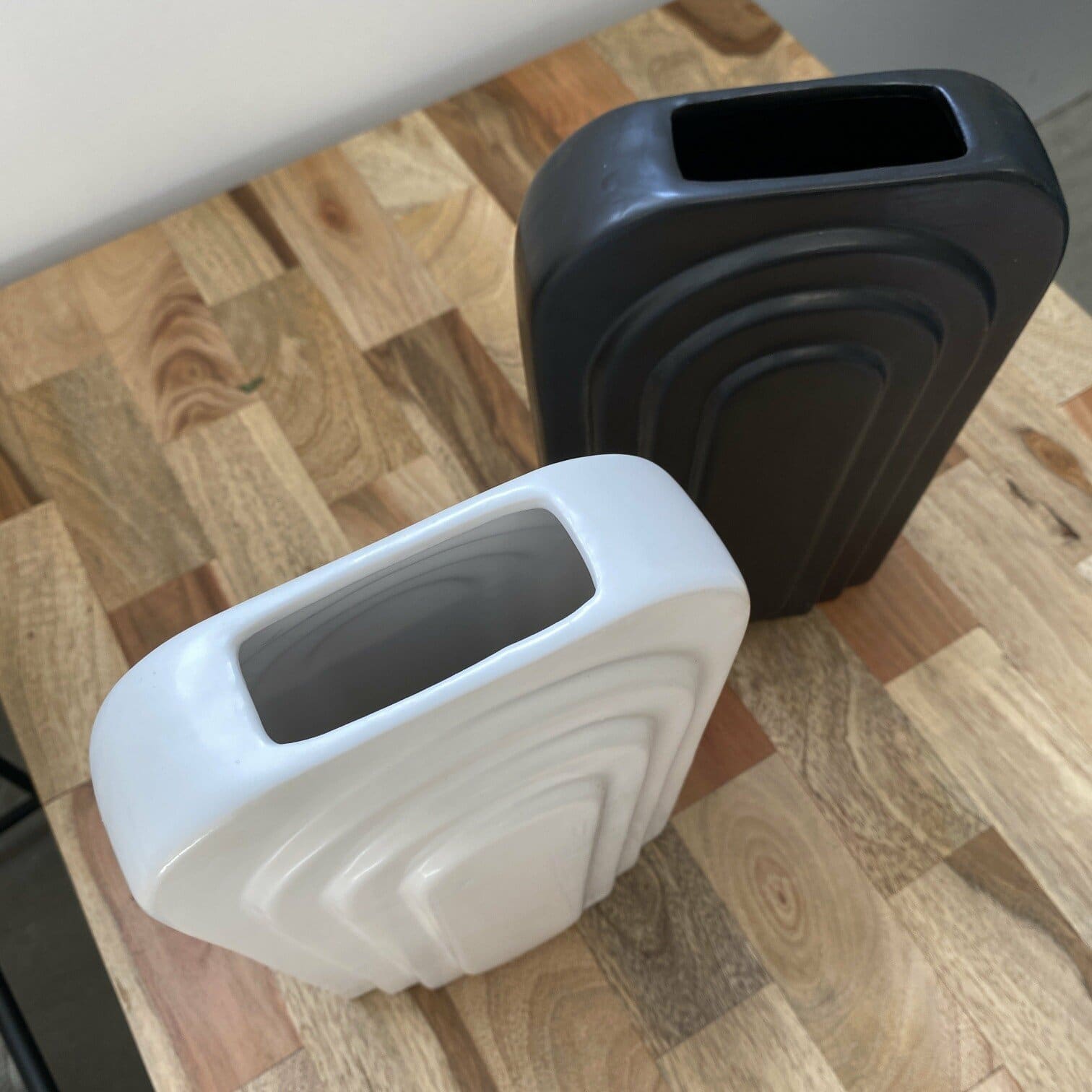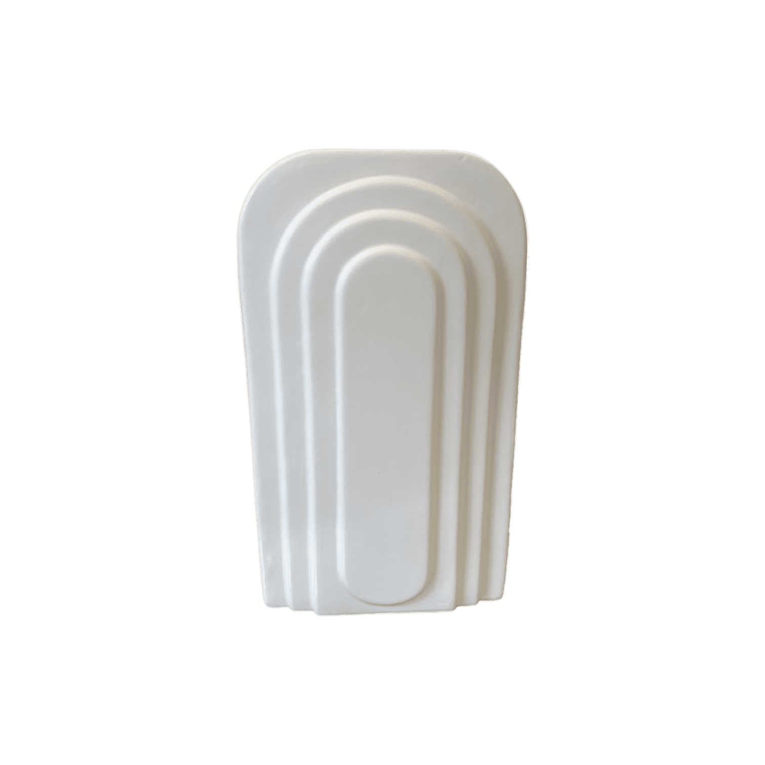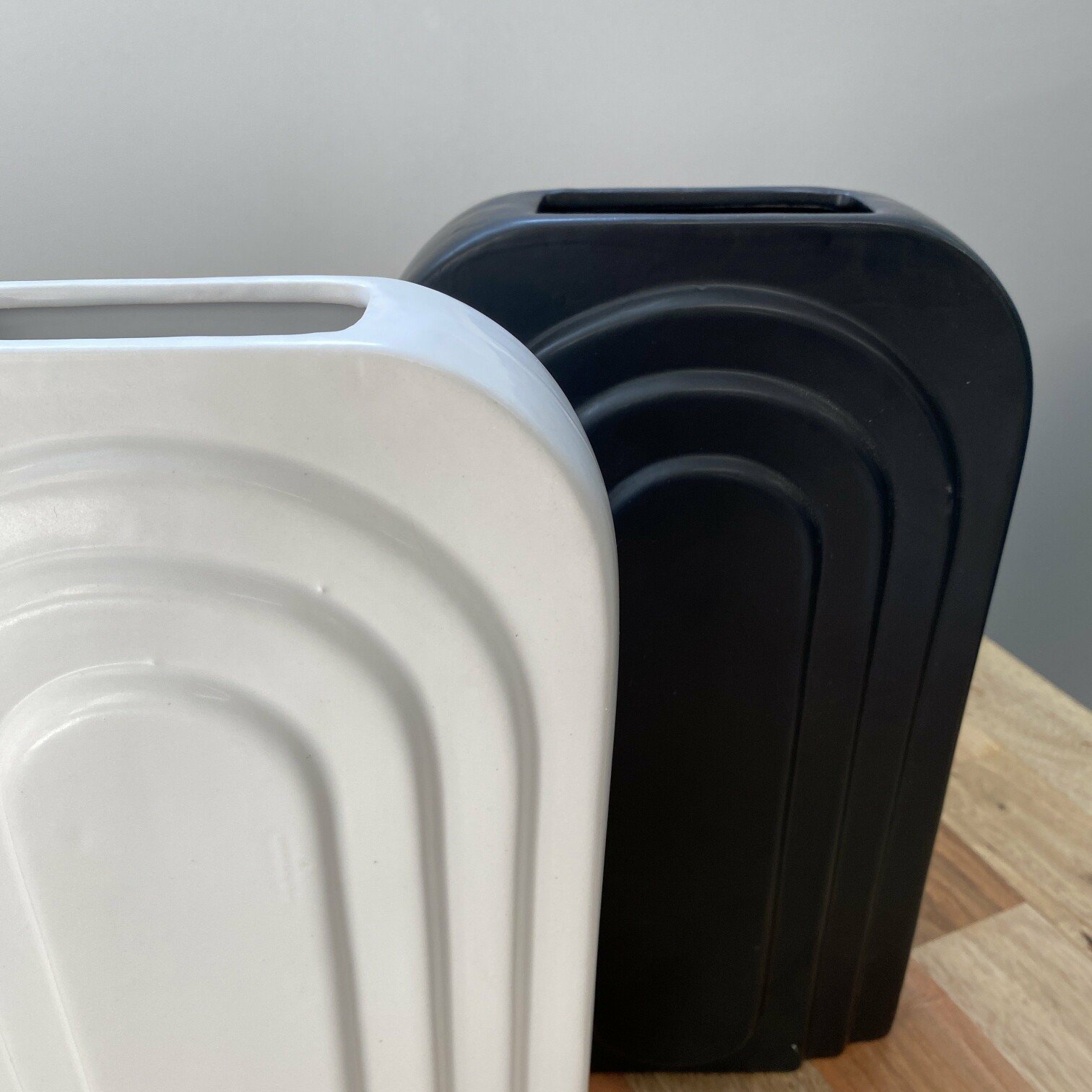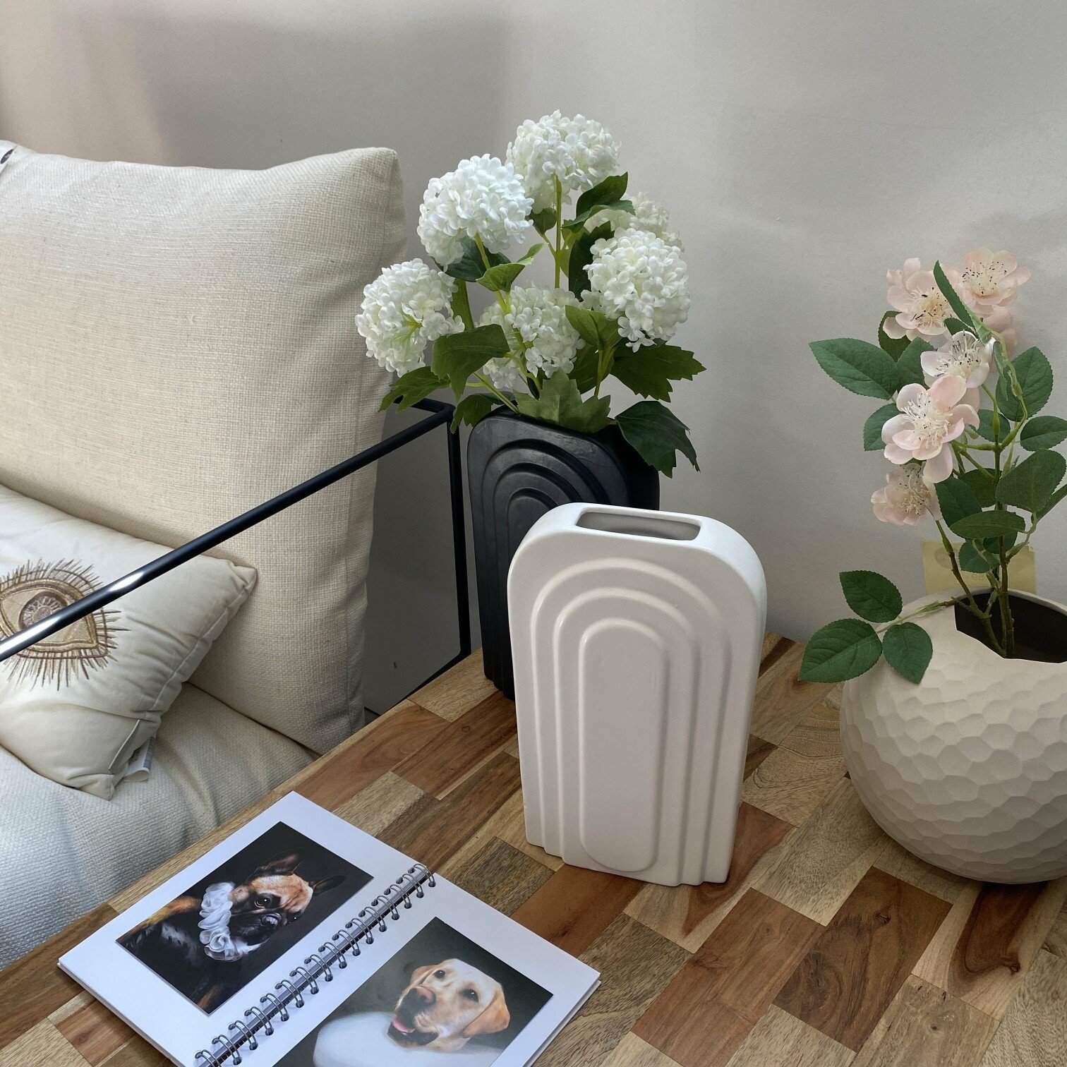 Keramikas vāze, baltā krāsā, laikmetīga, moderna, ar mākslinieciskiem arkveida lokiem kalpo arī kā dekoratīvs elements pat bez ziediem.