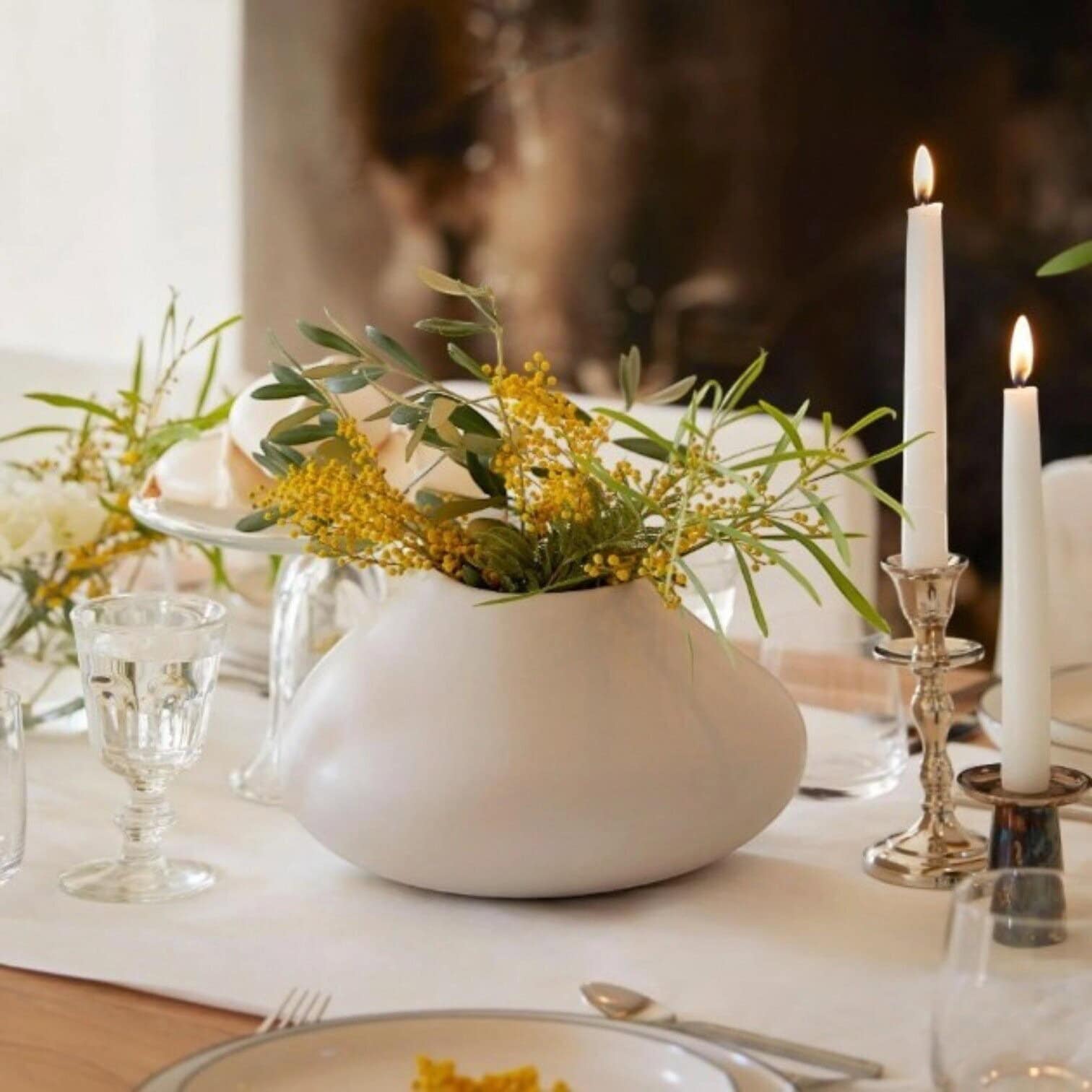 Vāze lieliski izceļ dabas materiālu skaistumu, padarot to par stilīgu centrālo elementu svētku galdam, viesistabai vai darba telpai. Tās neitrālā krāsa viegli sader ar dažādiem interjera stiliem — skandināvu, modernu, boho vai klasisku.