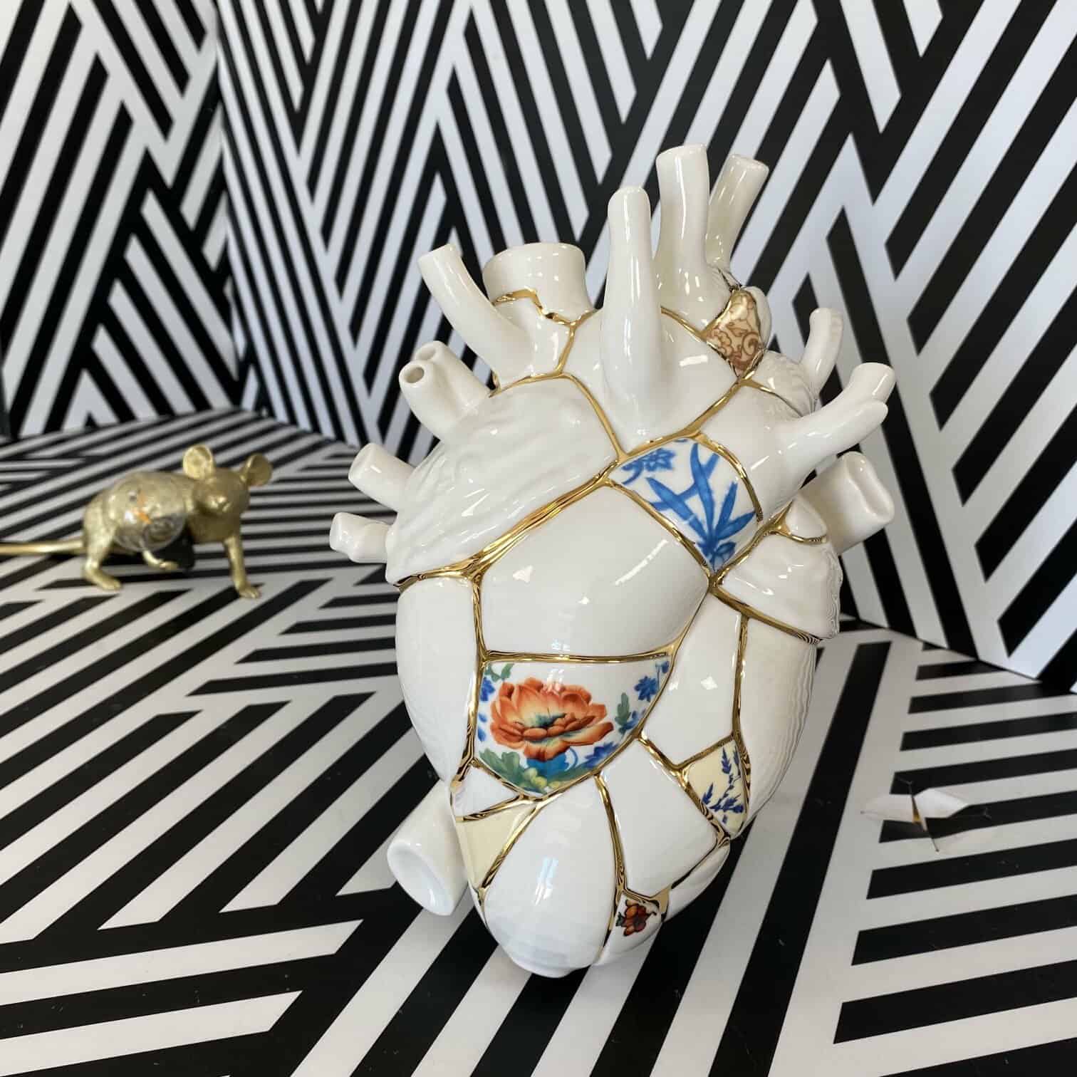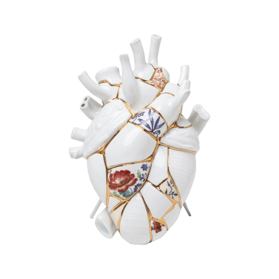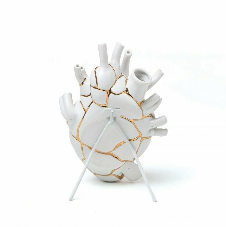 Ziedus liekam sirdī pa vēnām, it kā sirds būtu sīpols, no kura zied jūtu pumpuri.Šī sirds ir dzīvojusi un tagad ar zelta gabaliņiem, kas savienoti ar zeltu, stāsta mums savu vēsturi ar spēcīgu identitāti un estētiku.