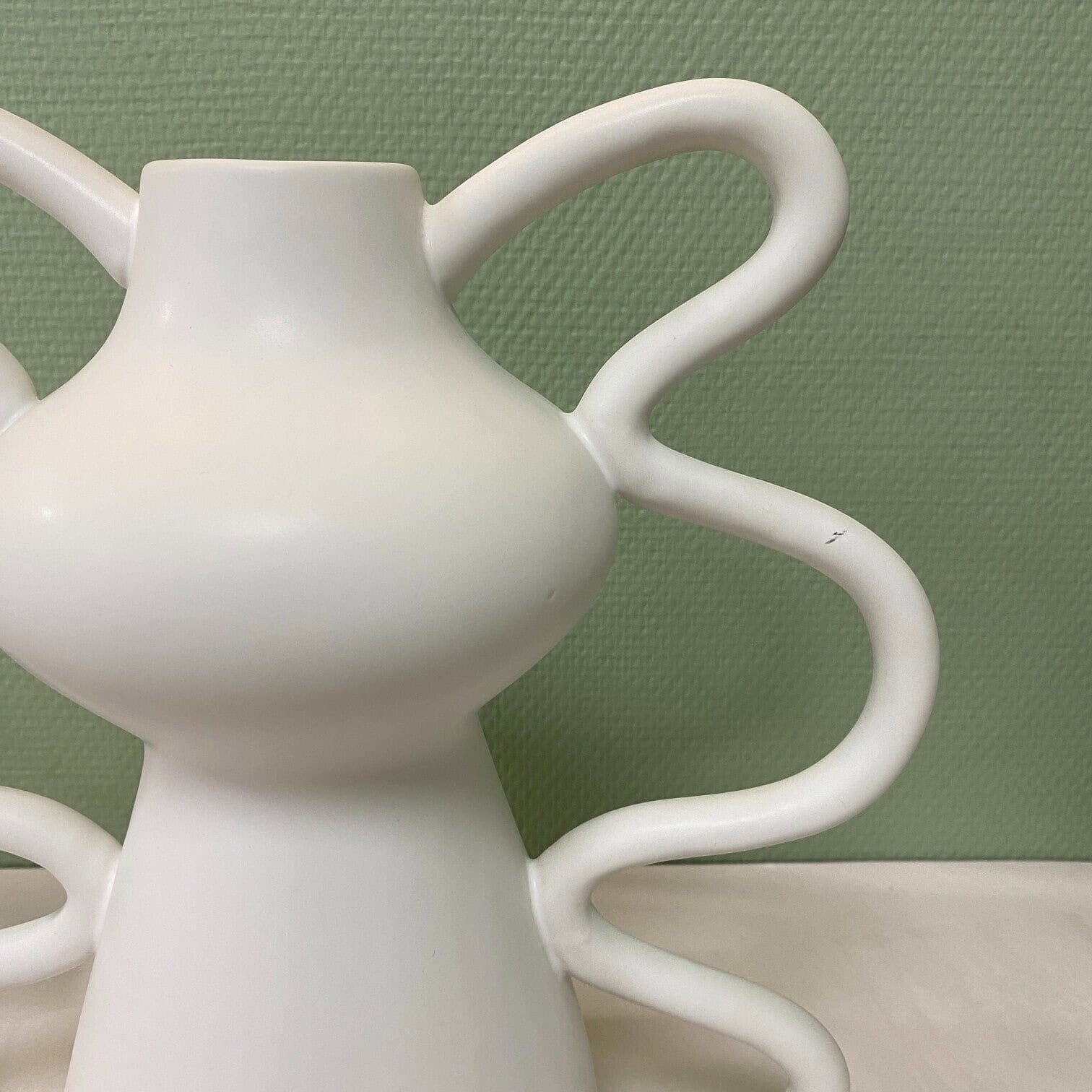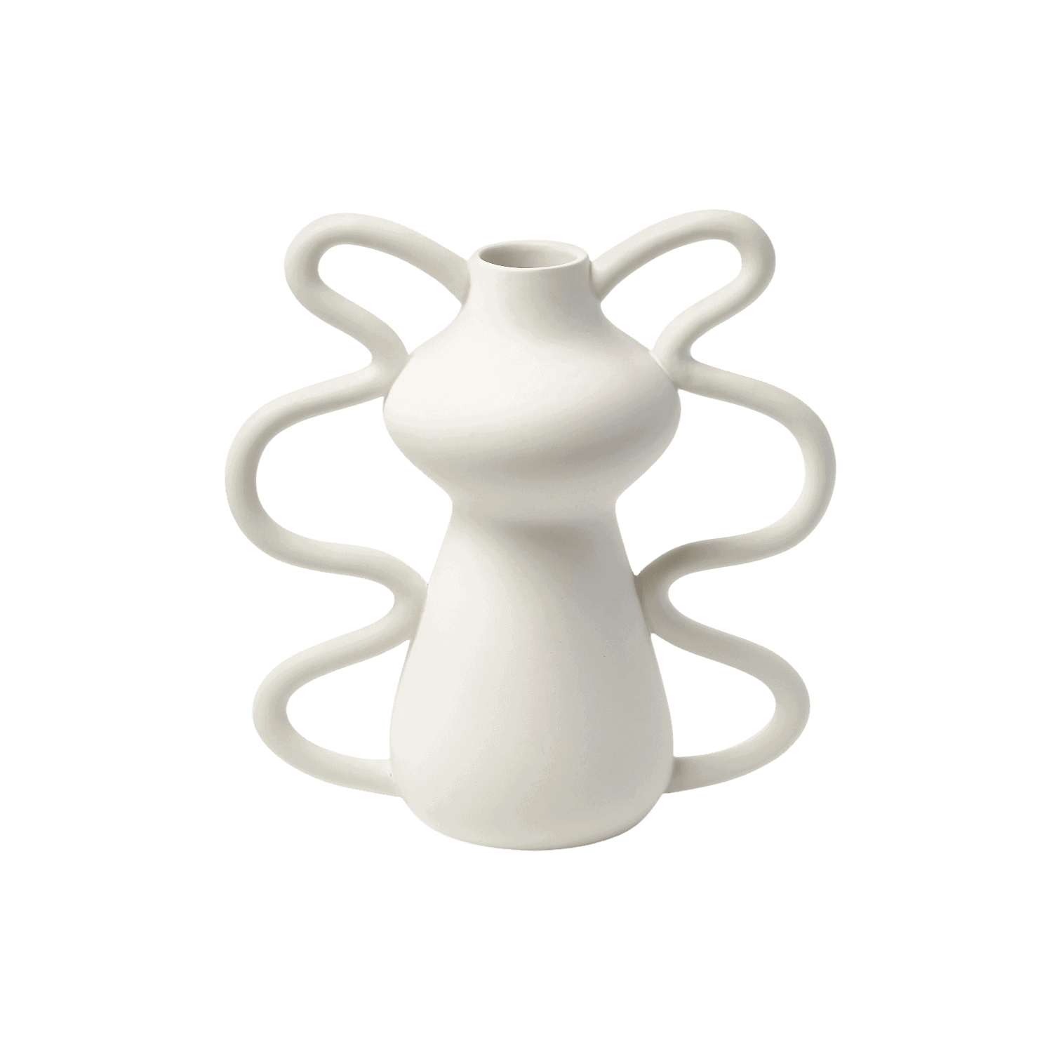 Eleganta un mūsdienīga māla vāze piena baltā tonī ar maigu, matētu apdari. Tās skulpturālā forma ar plūstošām, cilpveida līnijām piešķir interjeram izteiksmīgu akcentu un padara vāzi par dizaina objektu pat bez ziediem.