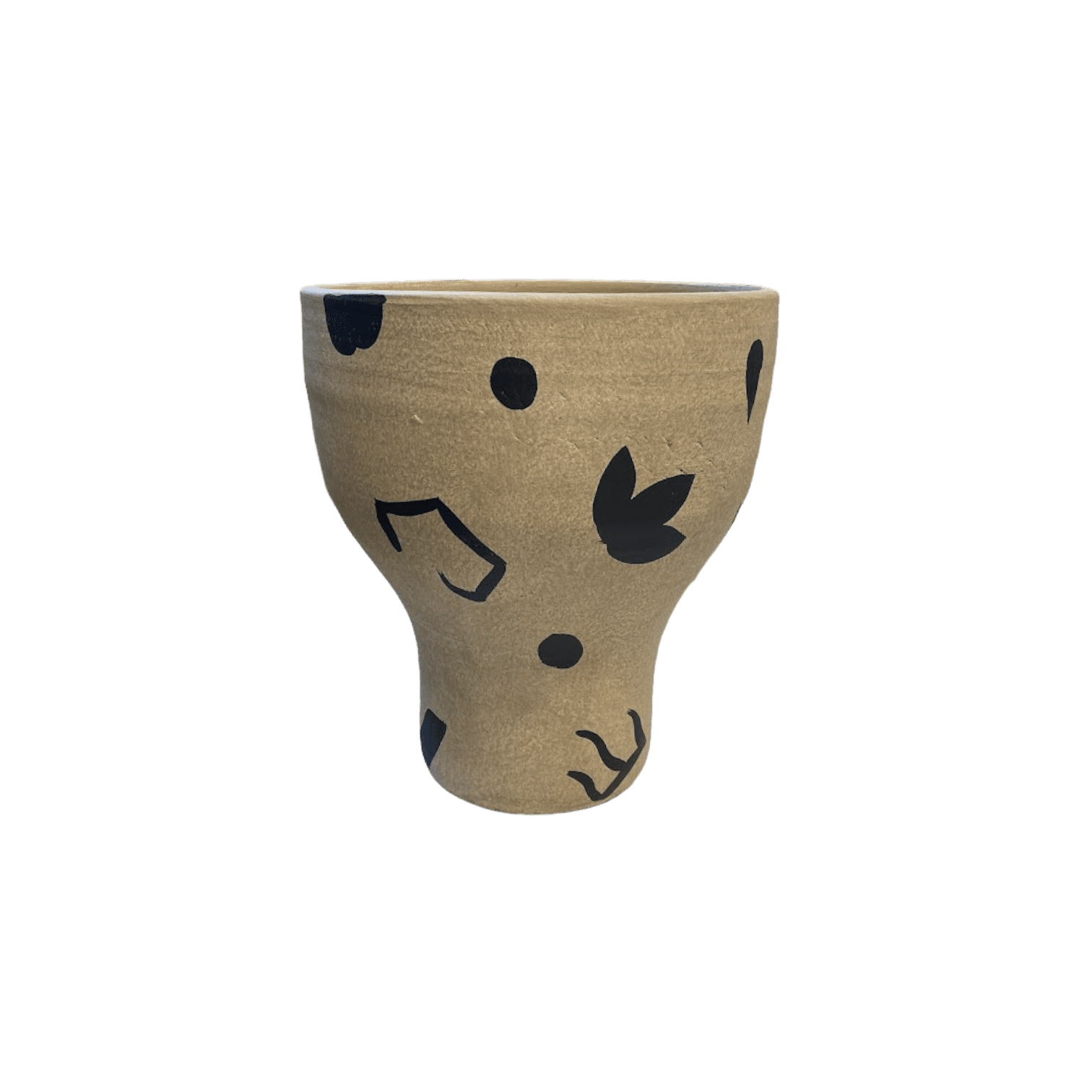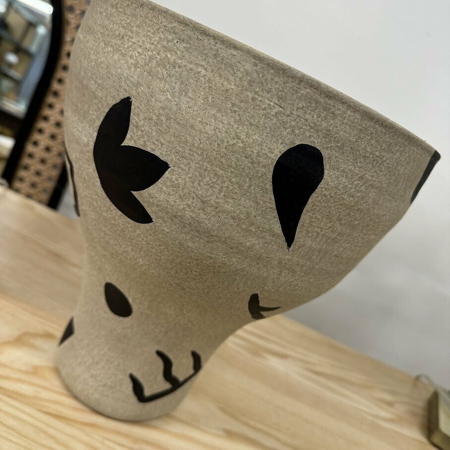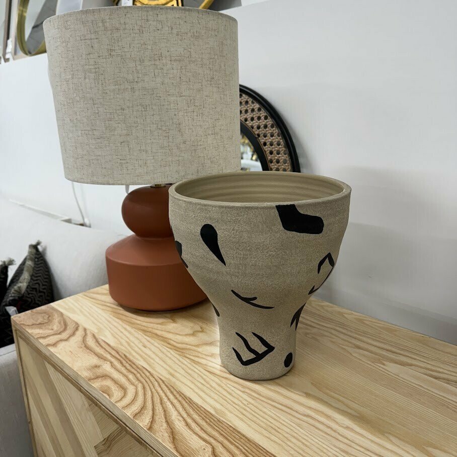Vāze ir izgatavota no brūnas terakotas. Tai ir vienkāršas, mīkstas un krūzei līdzīgas formas ar plašu atvērumu augšpusē. Papildus terakotas dabiskajai krāsu variācijai un faktūrai šī vāze ir dekorēta ar nelieliem, melniem, ar rokām veidotiem grafiskiem zīmējumiem, kas katru vāzi padara unikālu. Skaists galda, palodzes vai kumodes dekors.