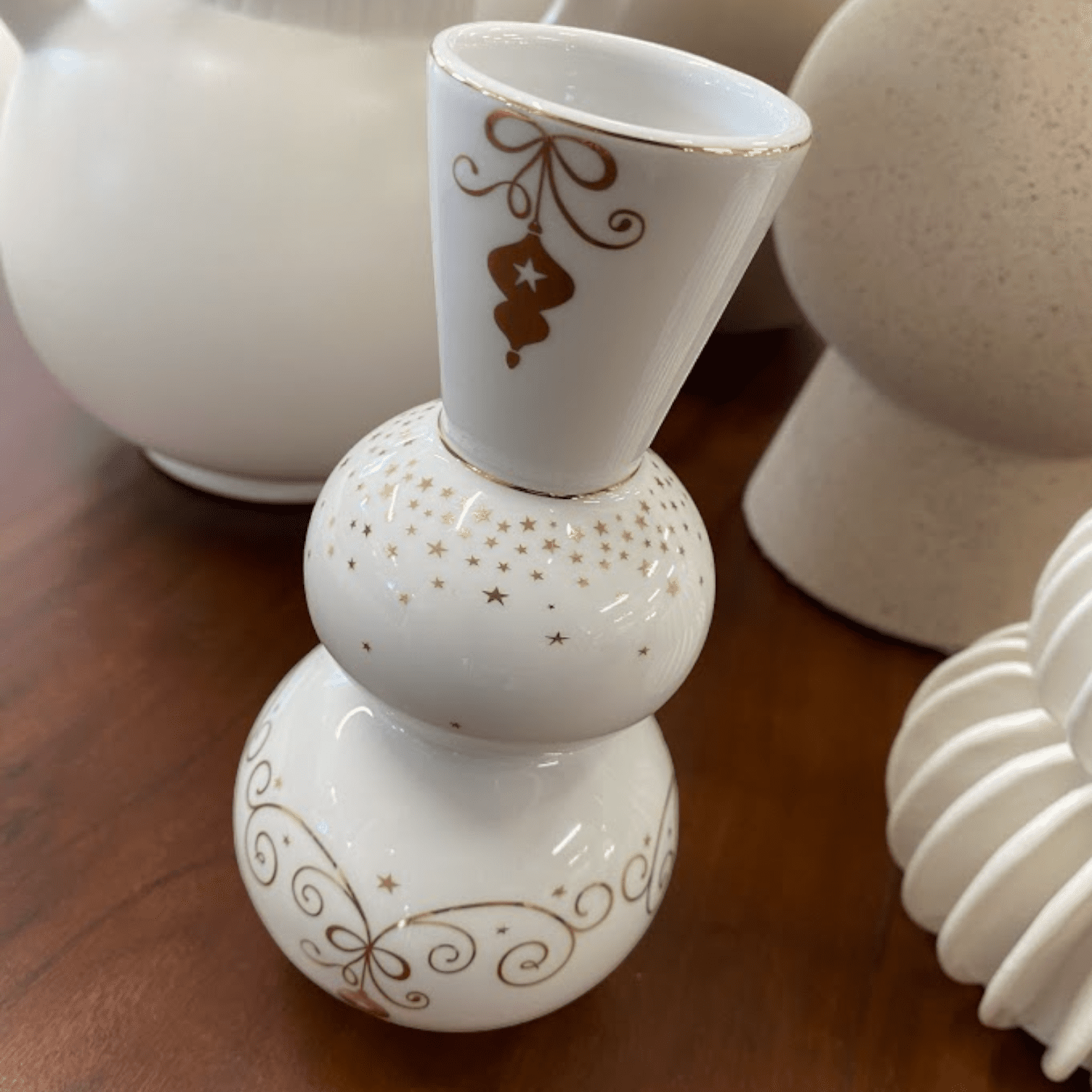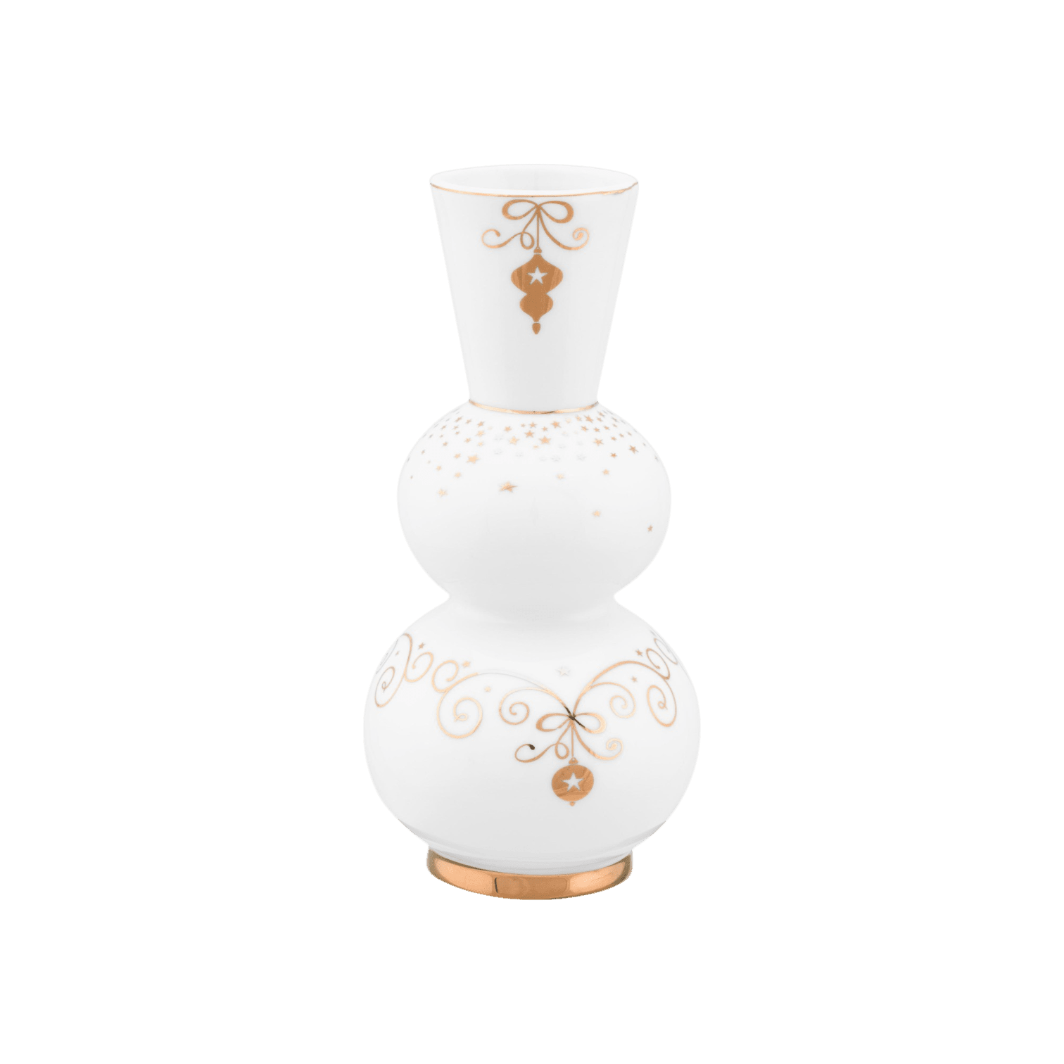 Apaļas formas vāze ir balta, un tā ir dekorēta ar zelta detaļām – Ziemassvētku rotājumi un zvaigznes. Kombinējiet un saskaņojiet ar pārējo Royal Winter kolekciju, lai radītu svētku atmosfēru uz pusdienu galda vai jūsu mājās