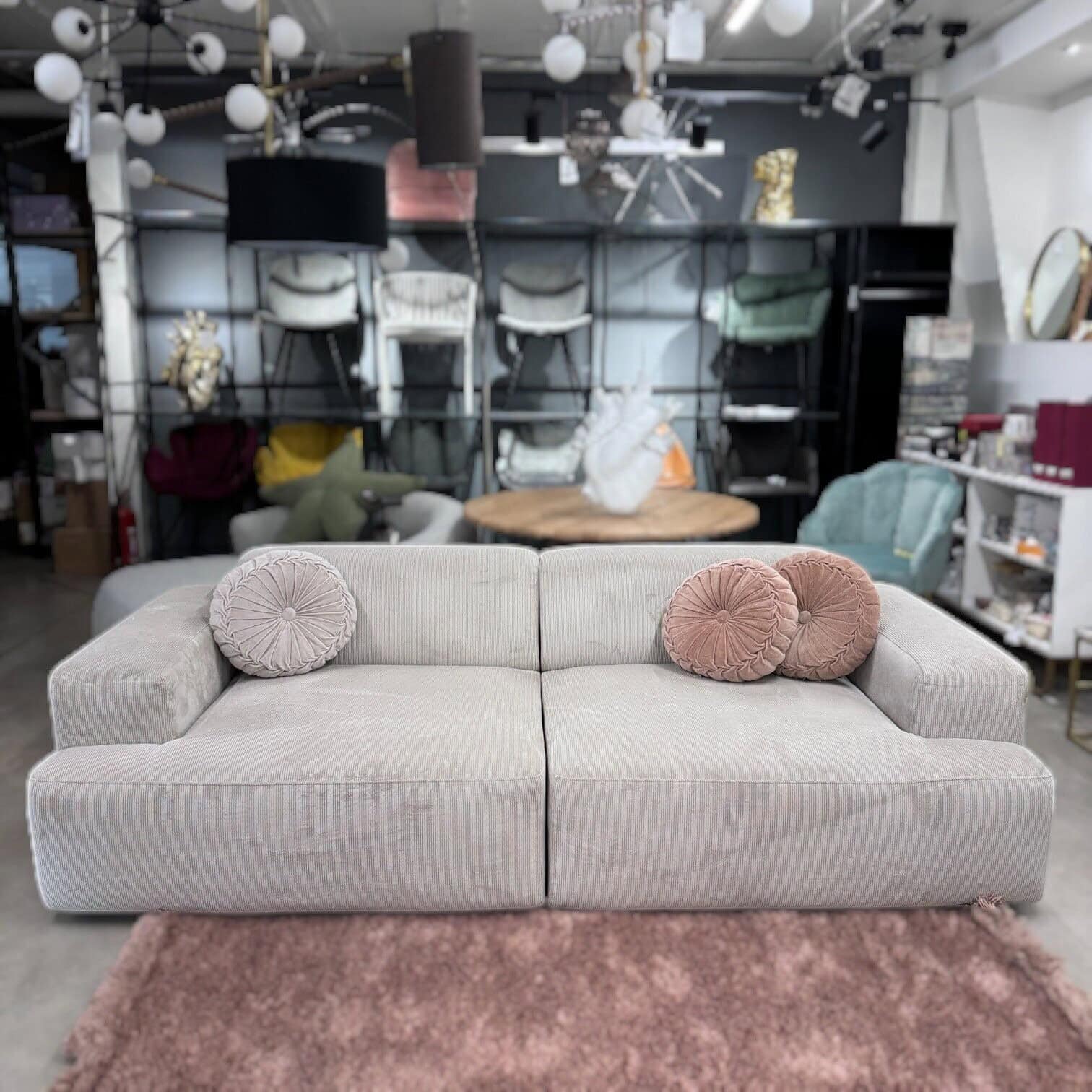 Šis ir elegants un moderns dīvāns, kas pārklāts ar smalku samtam līdzīgu velveta audumu gaiši pelēkā tonī. Tā dizains ir minimālistisks un zems, ar platiem roku balstiem un taisnām līnijām, kas piešķir tam mūsdienīgu izskatu.