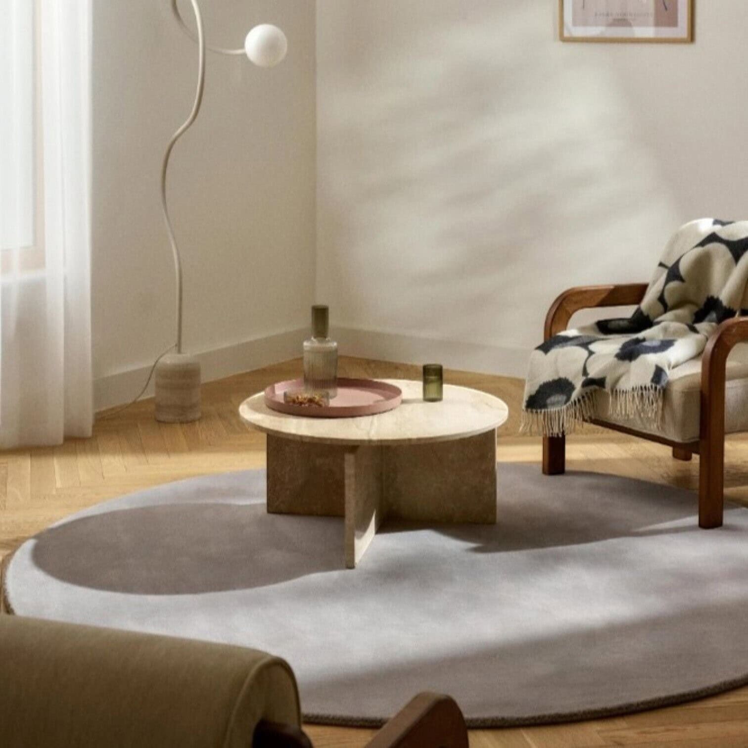Elegantais apaļais paklājs neitrālā pelēkā tonī piešķir telpai siltumu un mierīgu noskaņu. Paklāja virsma ir izgatavota no 100% dabīgas vilnas, kas nodrošina patīkamu maigumu, siltumizolāciju un ilgmūžību.