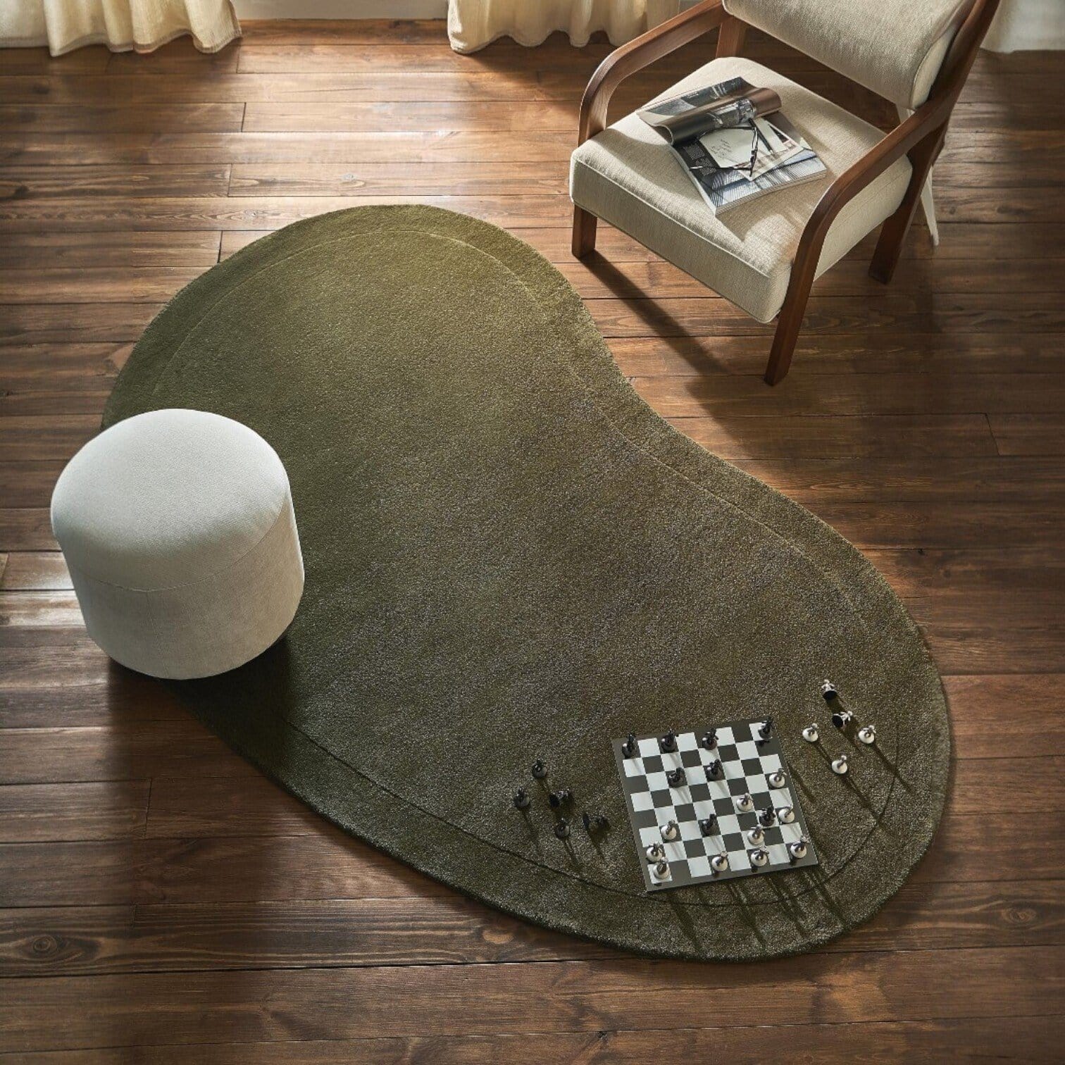 Šis elegantais vilnas paklājs izceļas ar organiski plūstošu, asimetrisku formu, kas piešķir telpai dinamiku un vizuālu interesi. Tā neitrālais, dabas iedvesmotais tonis harmoniski iekļaujas dažādos interjera stilos – no minimālisma un skandināvu dizaina līdz pat modernai klasikai. Paklājs nav tikai praktisks elements, bet arī izteiksmīgs dizaina akcents, kas palīdz radīt mājīgu un līdzsvarotu vidi.
