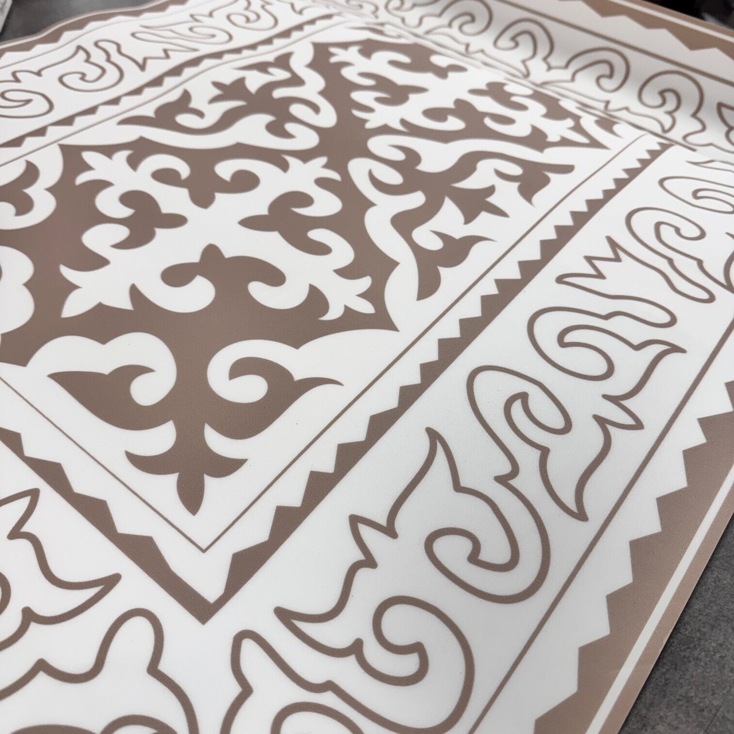 Stilīgs un praktisks plānā vinila paklājs, kas apvieno klasisku ornamentu dizainu ar mūsdienīgu funkcionalitāti. Smalkais raksts neitrālos toņos piešķir telpai eleganci un vieglumu, lieliski iederoties gan modernā, gan klasiskā interjerā.