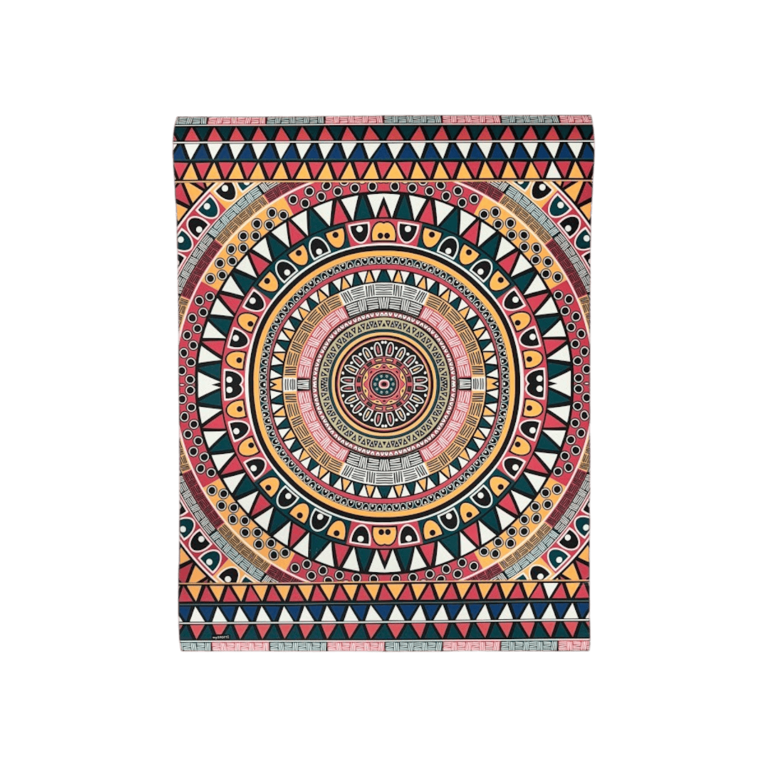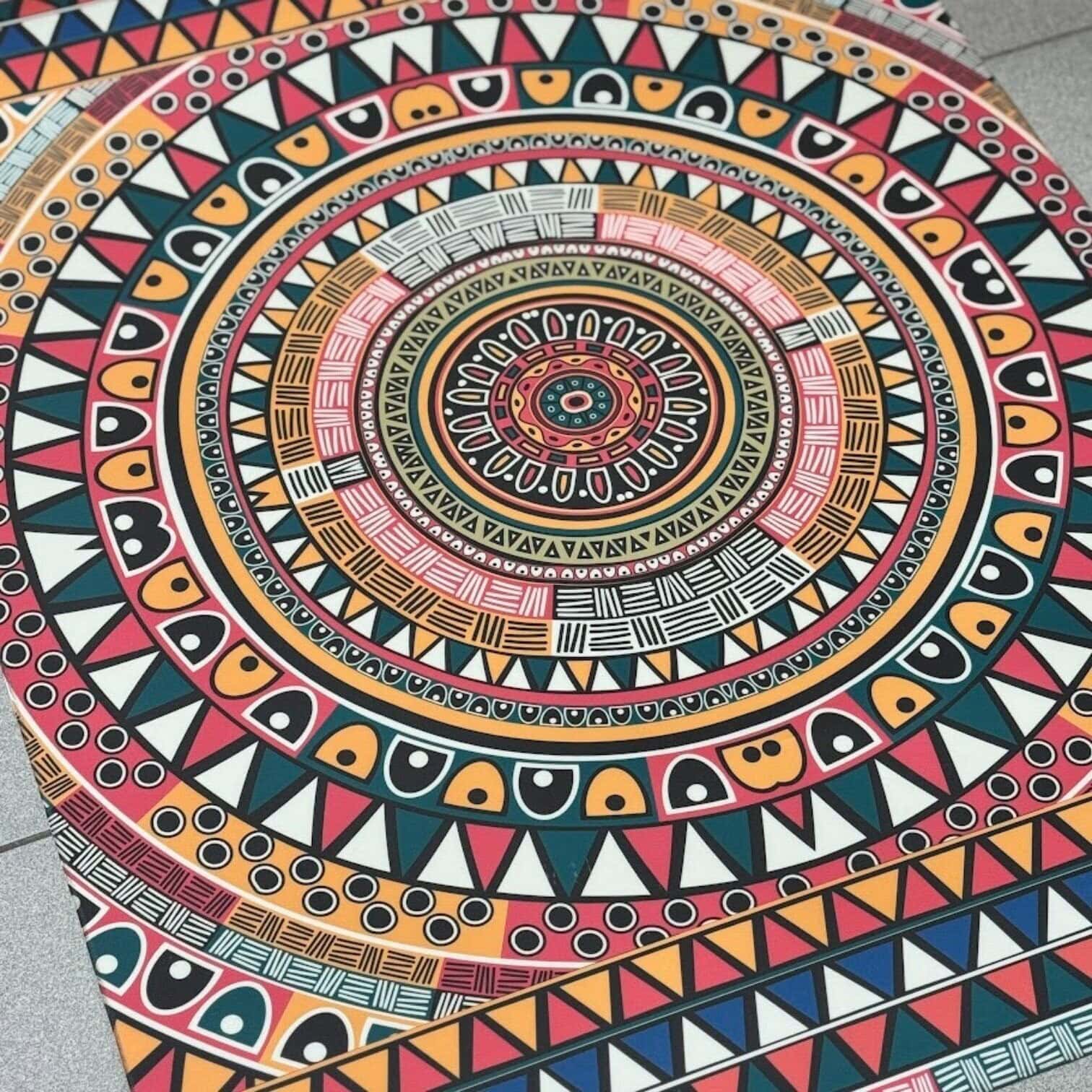 Vinila paklājs Bynoe, 65x85cm ir spilgts akcents jebkurā interjerā, pateicoties tā daudzkrāsainajam mandalas iedvesmotajam rakstam. Apvienojot ģeometriskus motīvus ar siltu un kontrastējošu krāsu paleti, tas piešķir telpai enerģiju un radošuma pieskaņu.