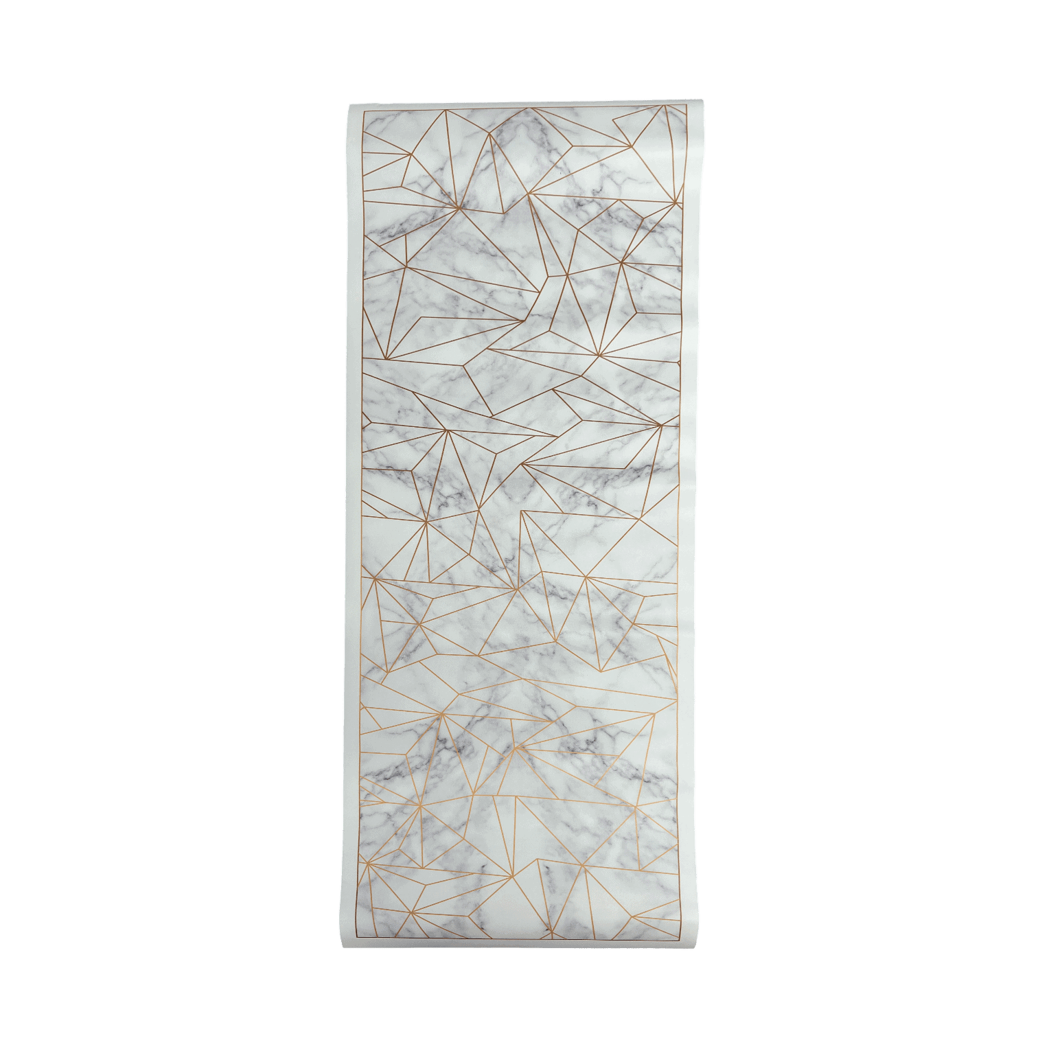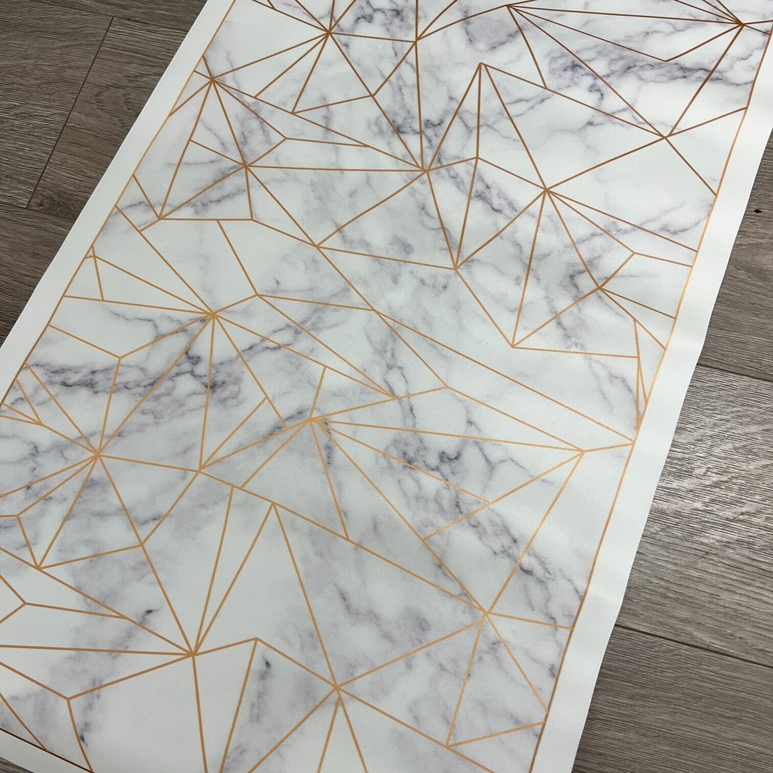 Šis vinila paklājs 48×116cm ar gaiša marmora rakstu un abstraktām zelta līnijām piešķir interjeram elegantu, modernu noskaņu. Smalkais marmora tonis rada tīrības un viegluma sajūtu, savukārt zeltainās līnijas piešķir dizainam izsmalcinātu akcentu un vieglu greznības pieskārienu.