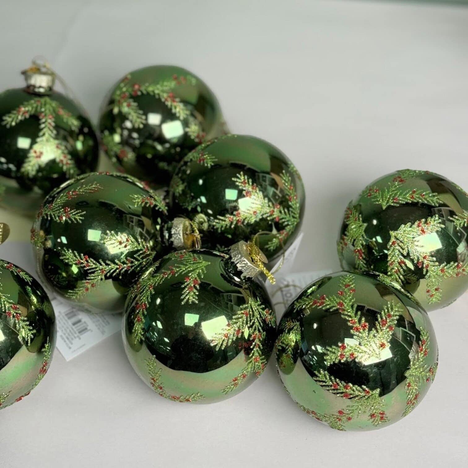 Eglīšu rotājumu komplekts Woods no zīmola Bizzotto ienesīs jūsu svētku dekorācijās dabisku eleganci un siltu Ziemassvētku noskaņu. Komplektā ietilpst astoņas stikla bumbiņas zaļā krāsā, rotātas ar smalku glitera egļu zaru apdruku un nelieliem sarkaniem punktiņiem, kas piešķir dizainam dzīvīgumu un svinīgu akcentu.