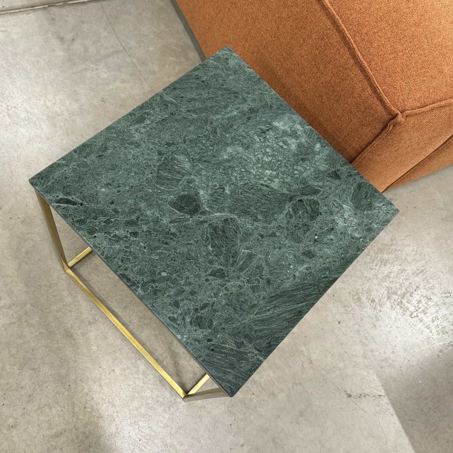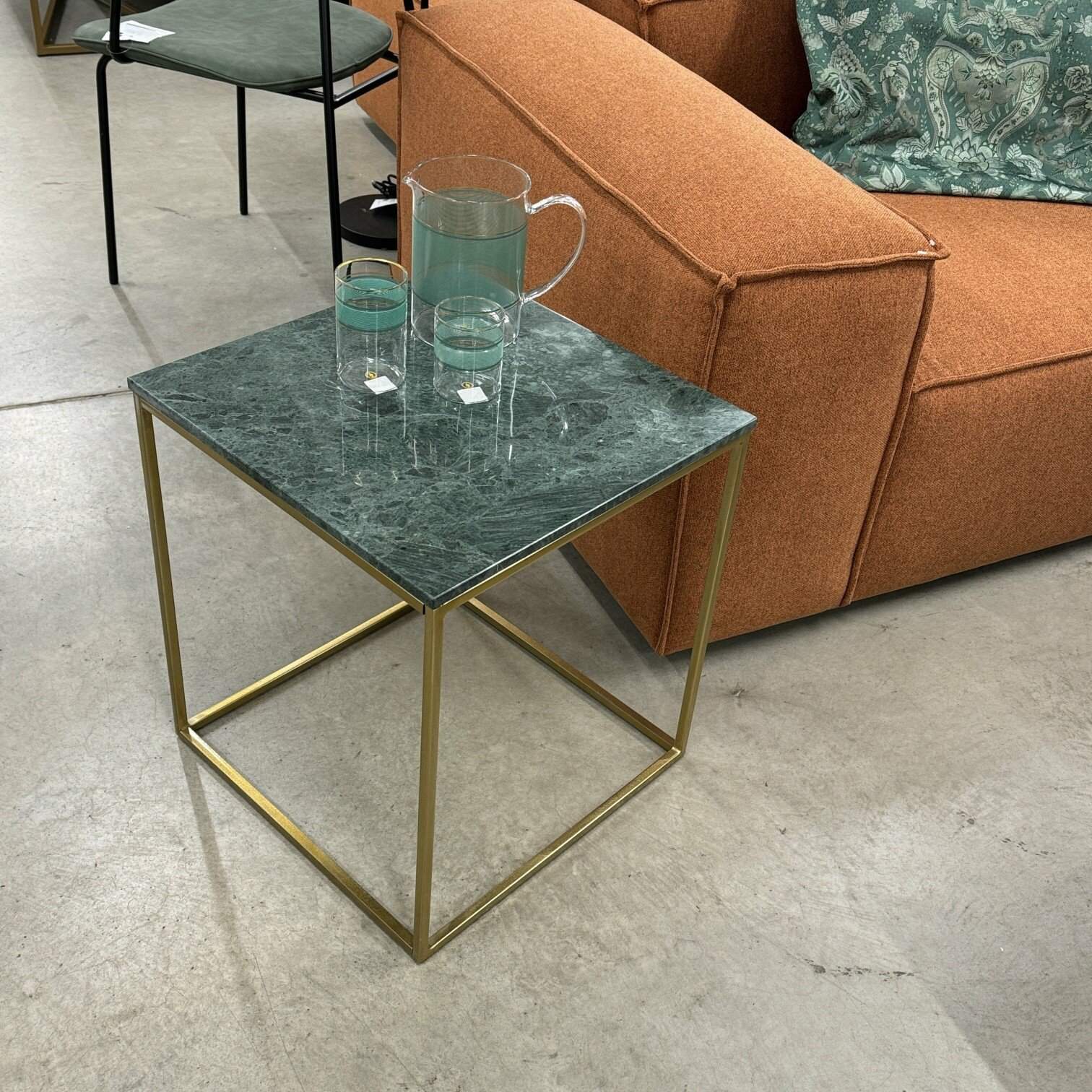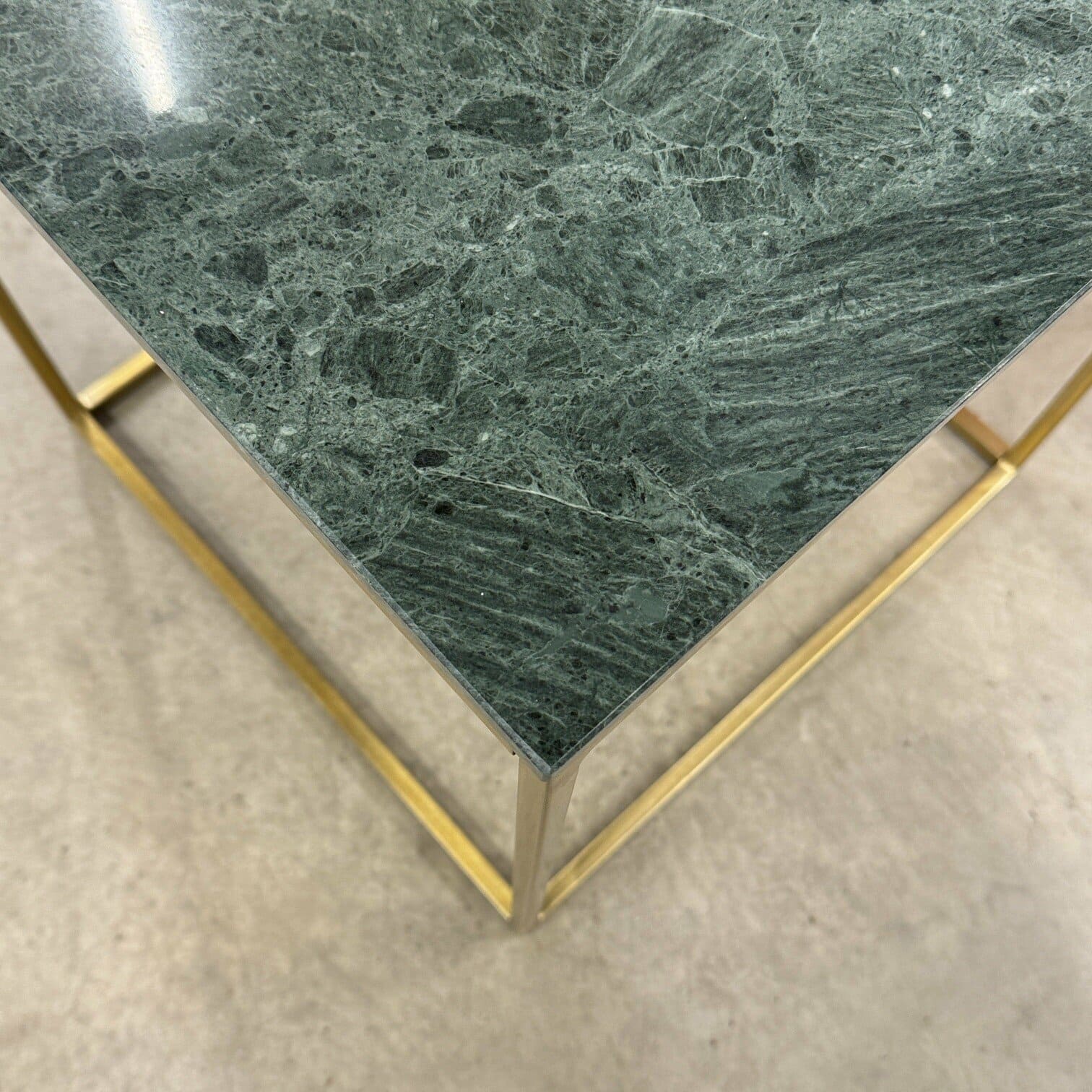 Zaļš marmora žurnālgalds ar zelta kuba rāmi. Lakoniska dizaina, iederēsies dažādu stilu interjeros. Marmora virsma žurnālgaldam iedod stabilitāti, marmors vienmēr ir un būs aktuāls materiāls, ko izvēlēties savu telpu iekārtošanai.