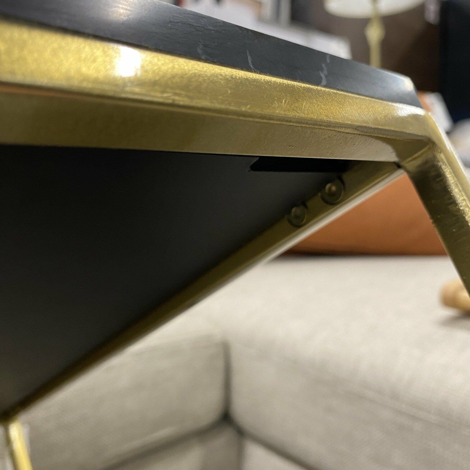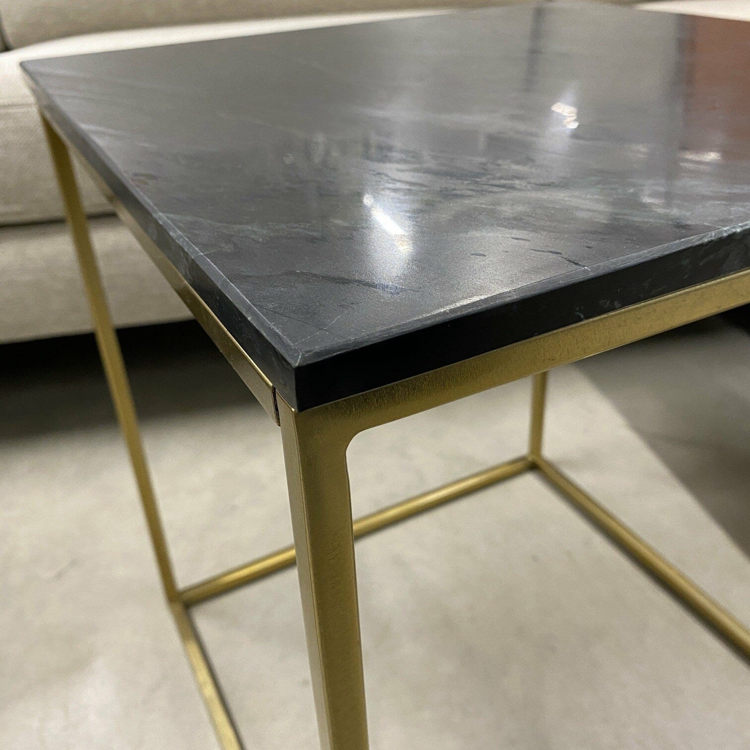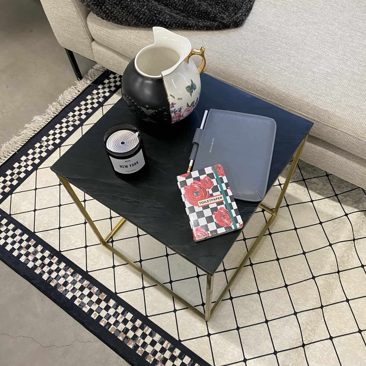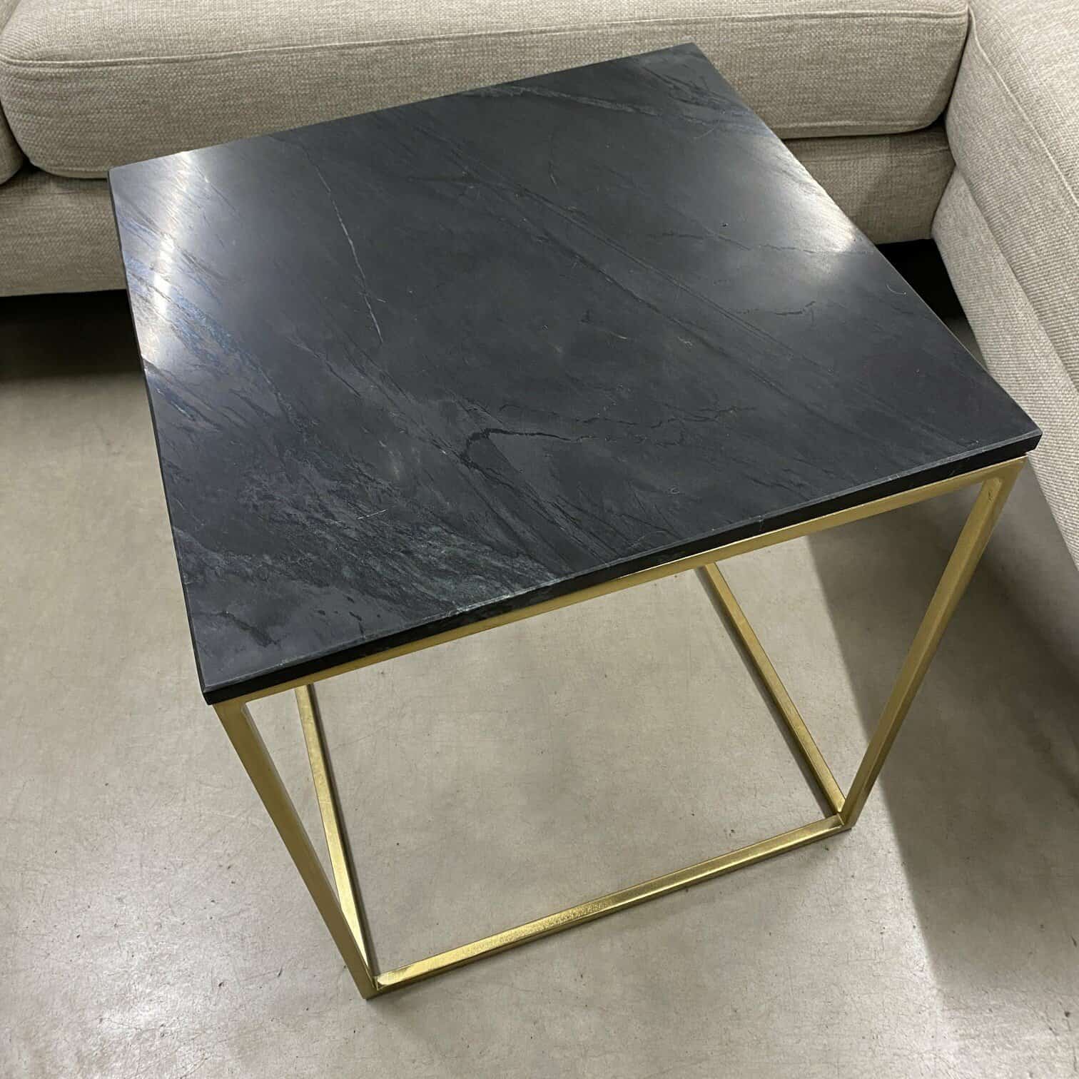 Melna marmora žurnālgalds ar zelta kuba rāmi. Lakoniska dizaina, iederēsies dažādu stilu interjeros. Marmora virsma žurnālgaldam iedod stabilitāti, marmors vienmēr ir un būs aktuāls materiāls, ko izvēlēties savu telpu iekārtošanai.