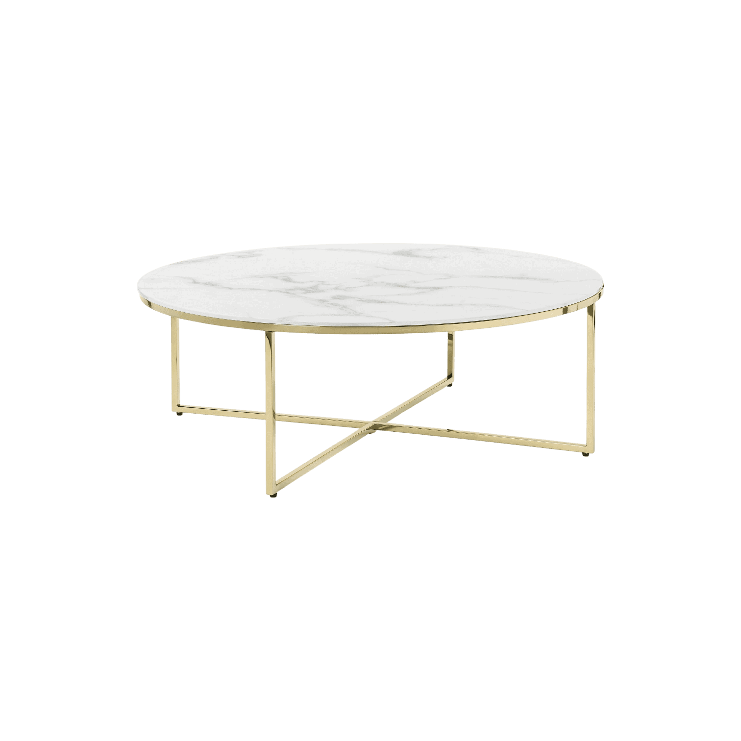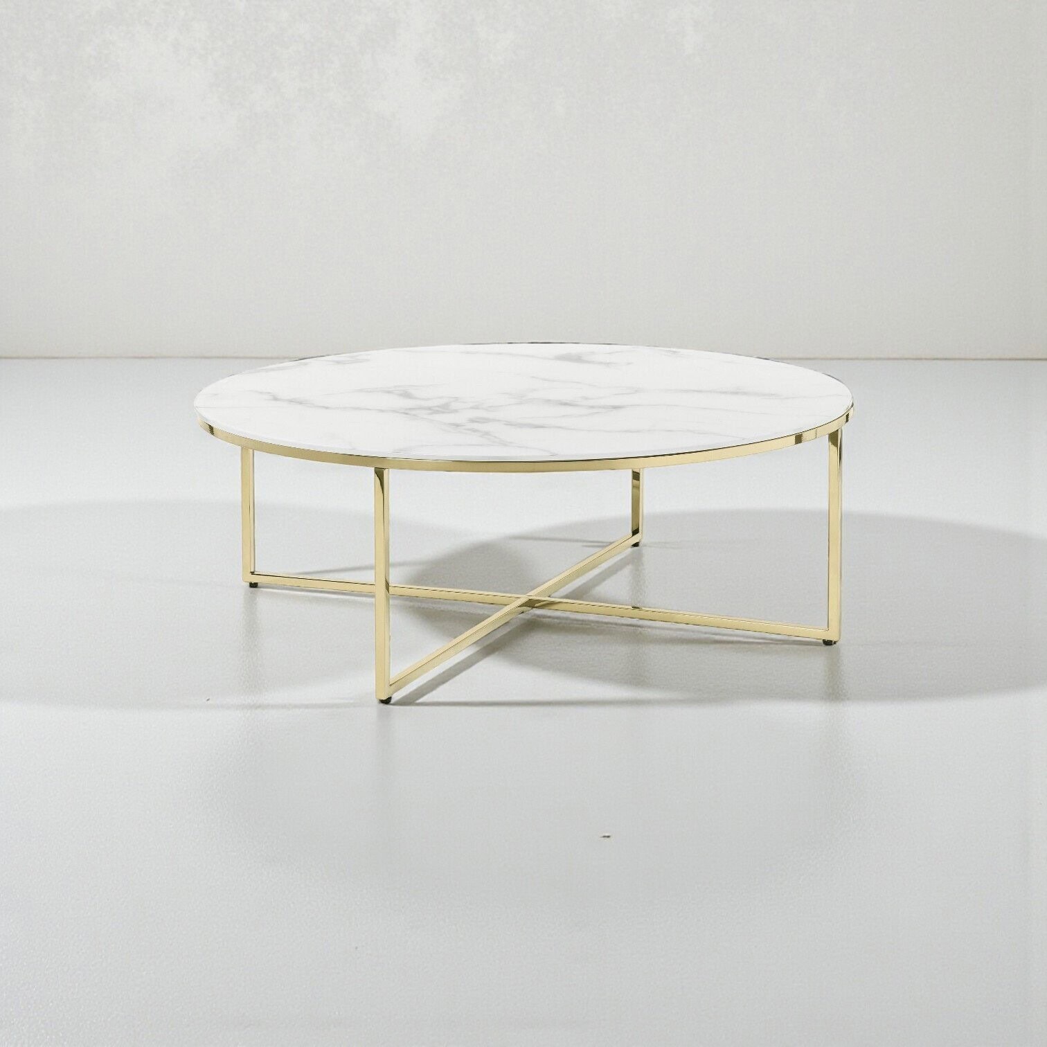 Elegants un mūsdienīgs žurnālgalds ar stikla virsmu, kas piešķir interjeram vieglumu un izsmalcinātu akcentu. Apaļā stikla galda virsma rada gaisīgu iespaidu un ir viegli kopjama, savukārt stabilais metāla rāmis zeltītā tonī nodrošina drošību un ilgmūžību. Krustotā pamatnes konstrukcija piešķir galdam unikālu dizainu un vizuālu dinamiku.