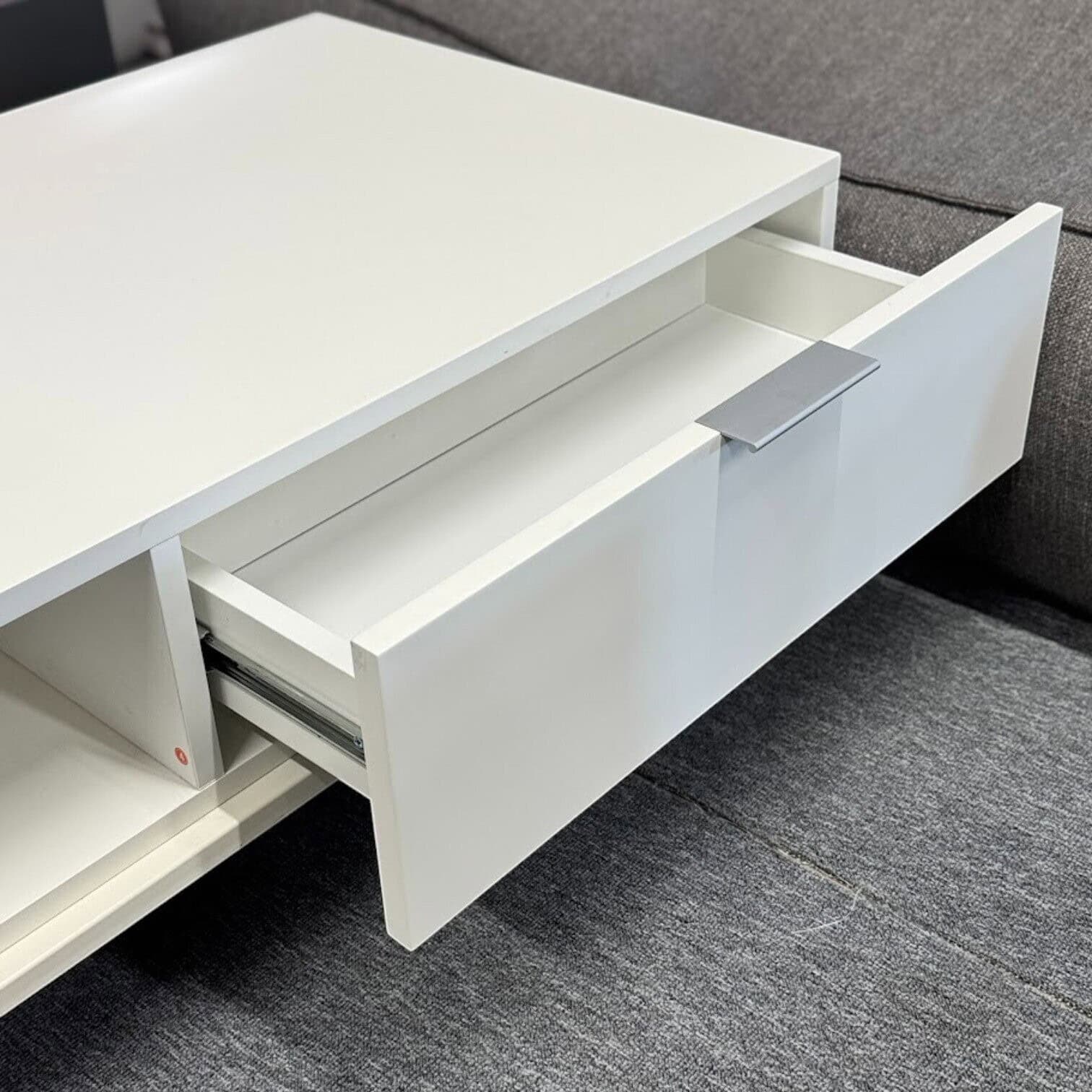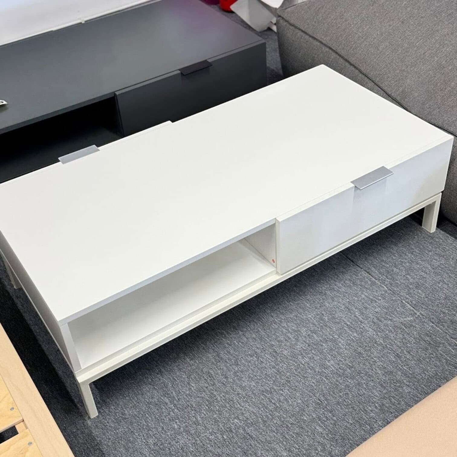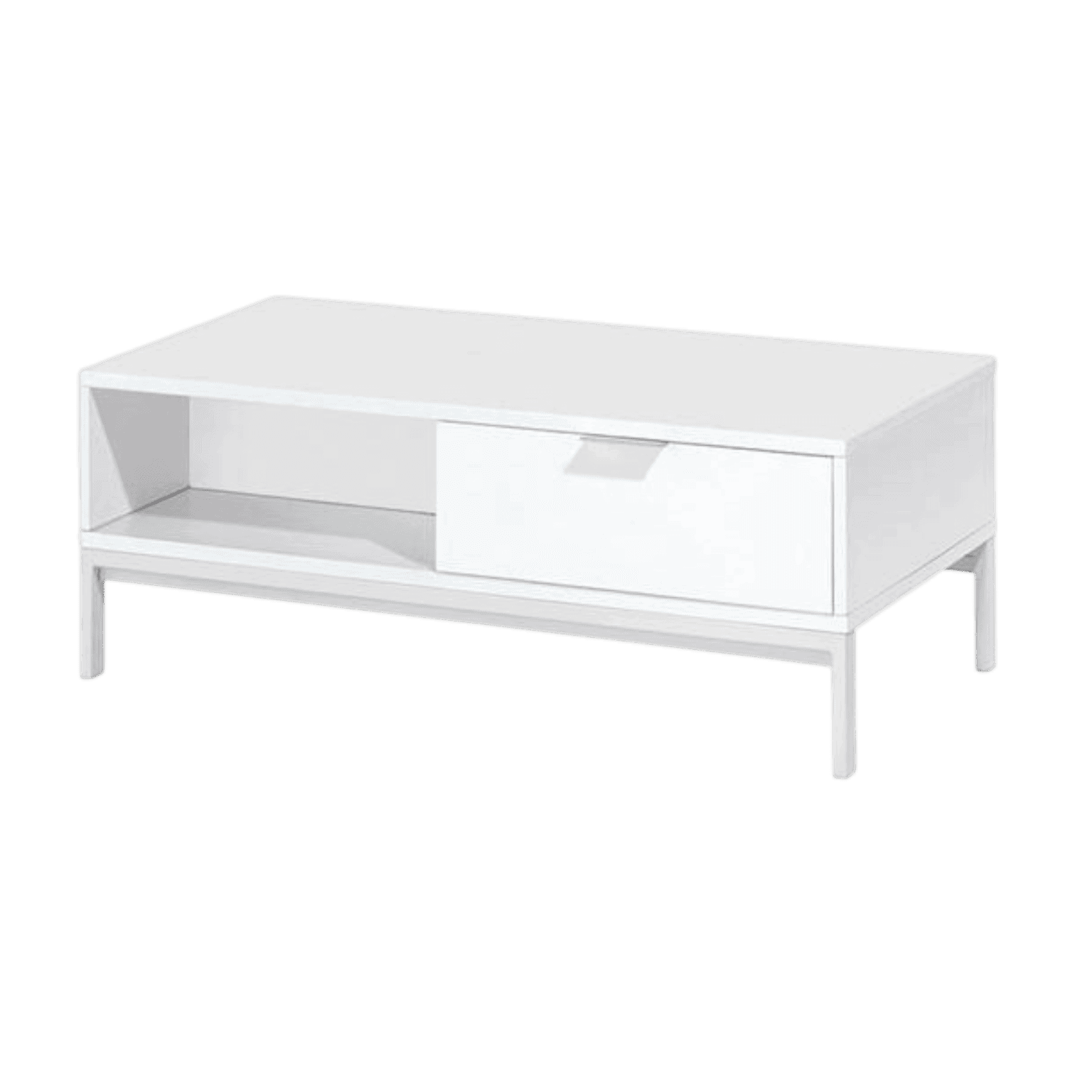 Galdiņam ir atklāts plaukts un slēgtas atvilktnes, kas ļauj ērti uzglabāt gan ikdienas lietas, gan dekoratīvos priekšmetus. Stabilā konstrukcija ar metāla kājām nodrošina izturību un ilgmūžību, savukārt zemais profils padara galdiņu par ērtu vietu kafijas tasītei, žurnāliem vai tālvadības pultīm.