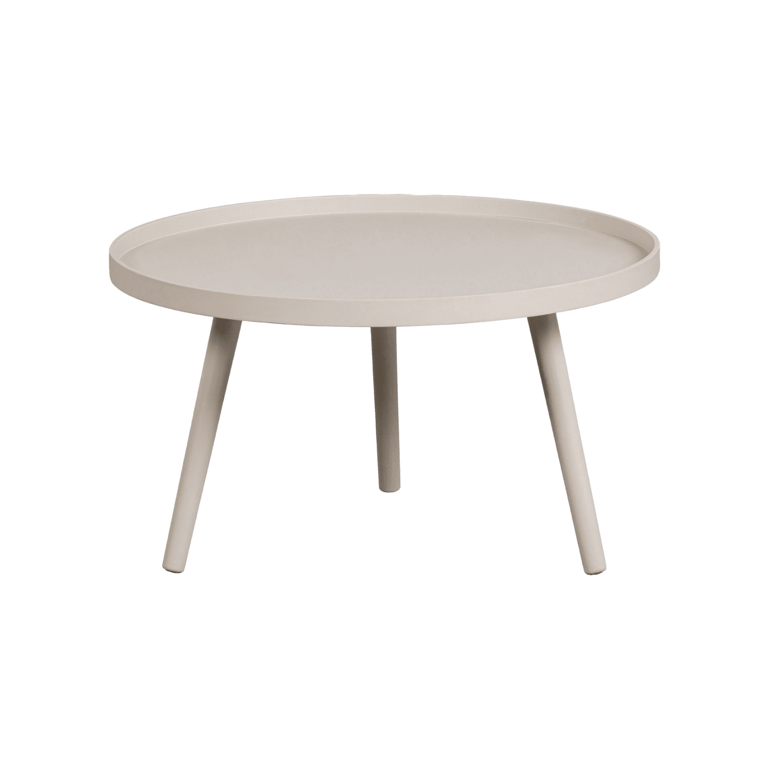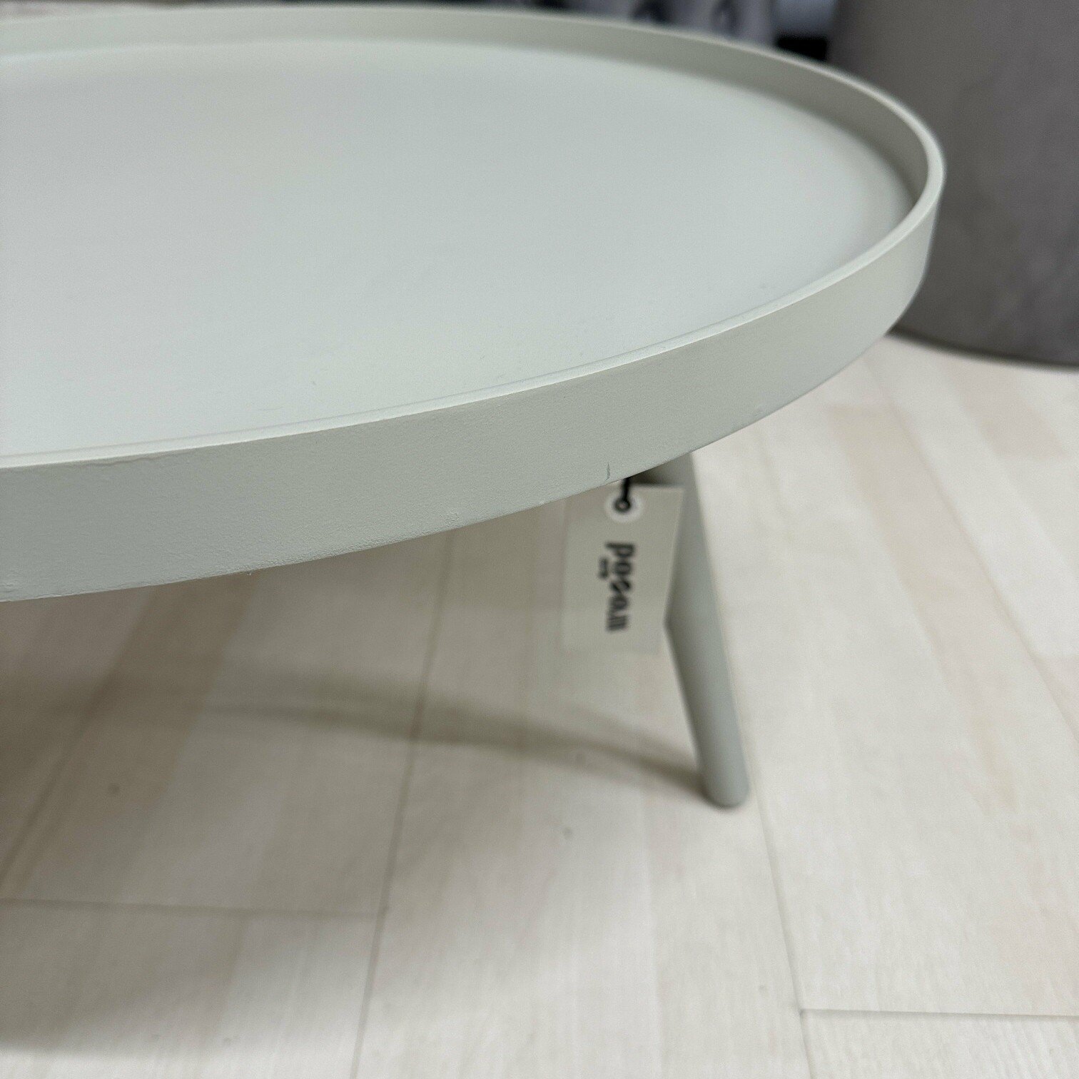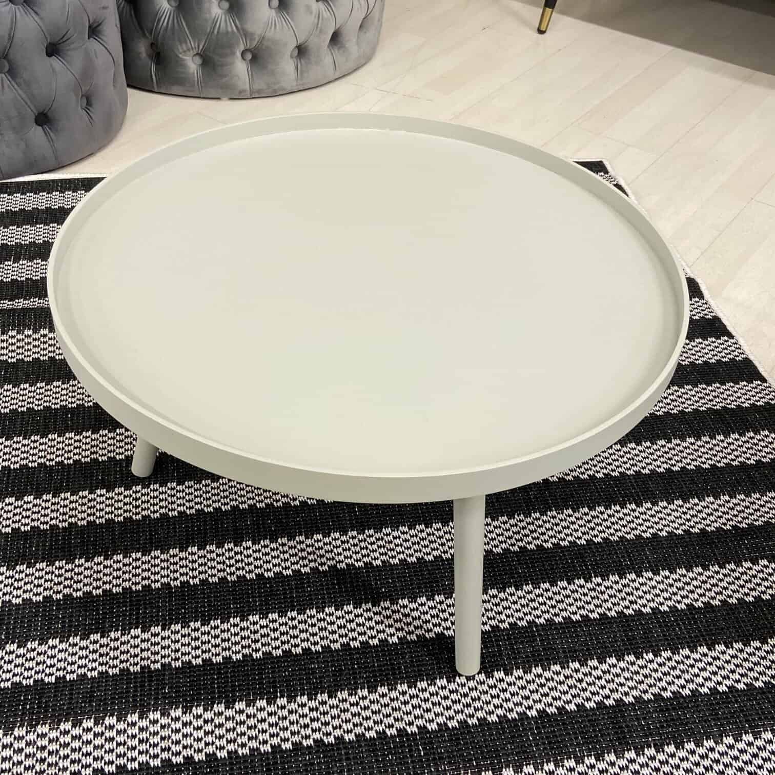 Neliels apaļš žurnālgalds uz trim kājām. Virsma ir ar paaugstinātu maliņu.
