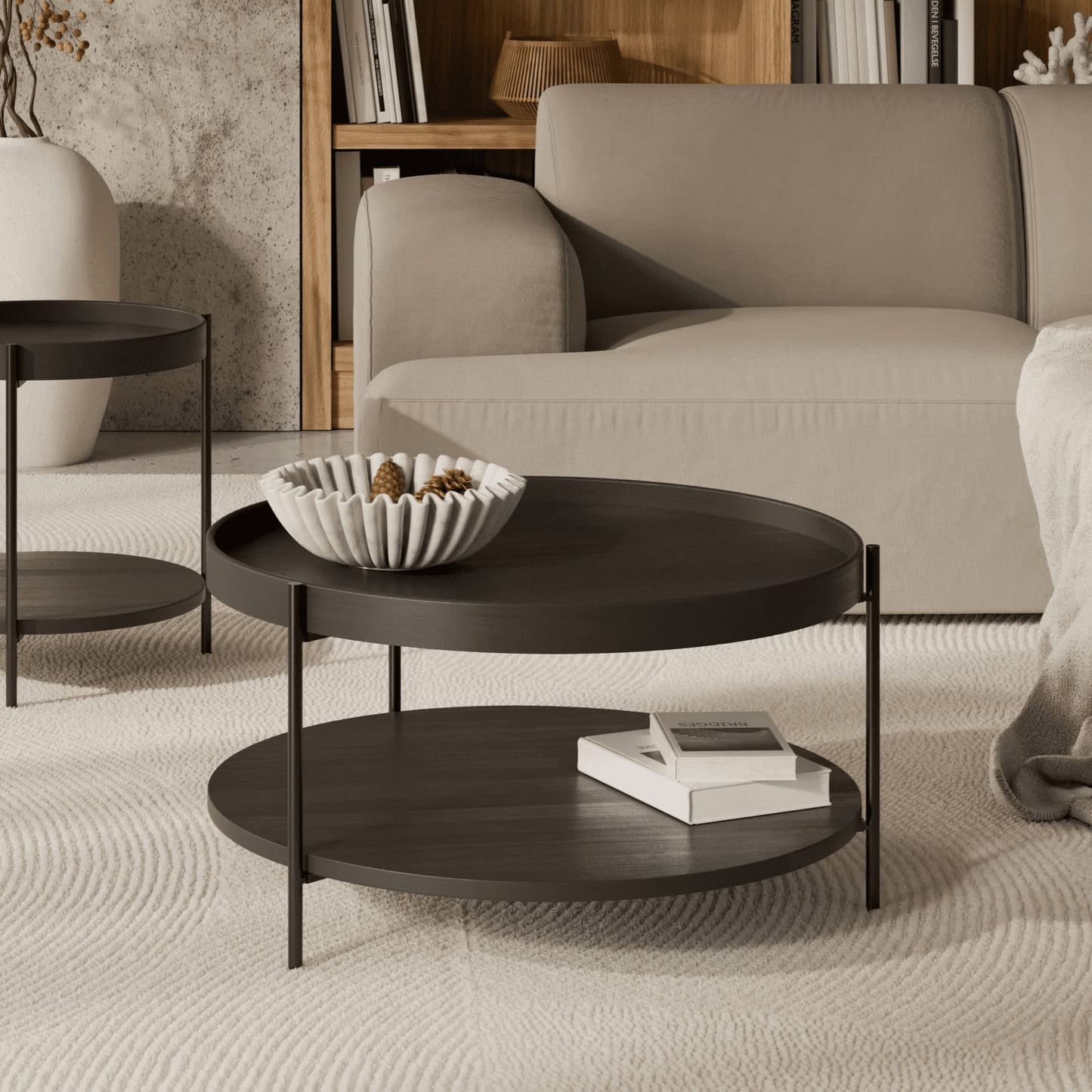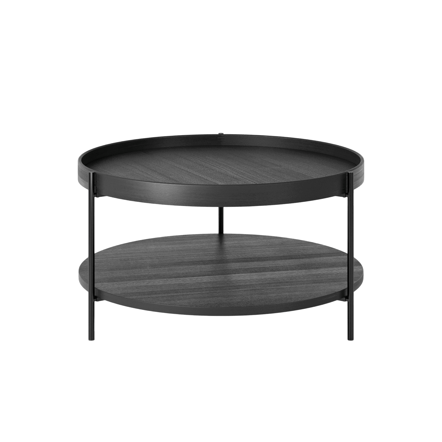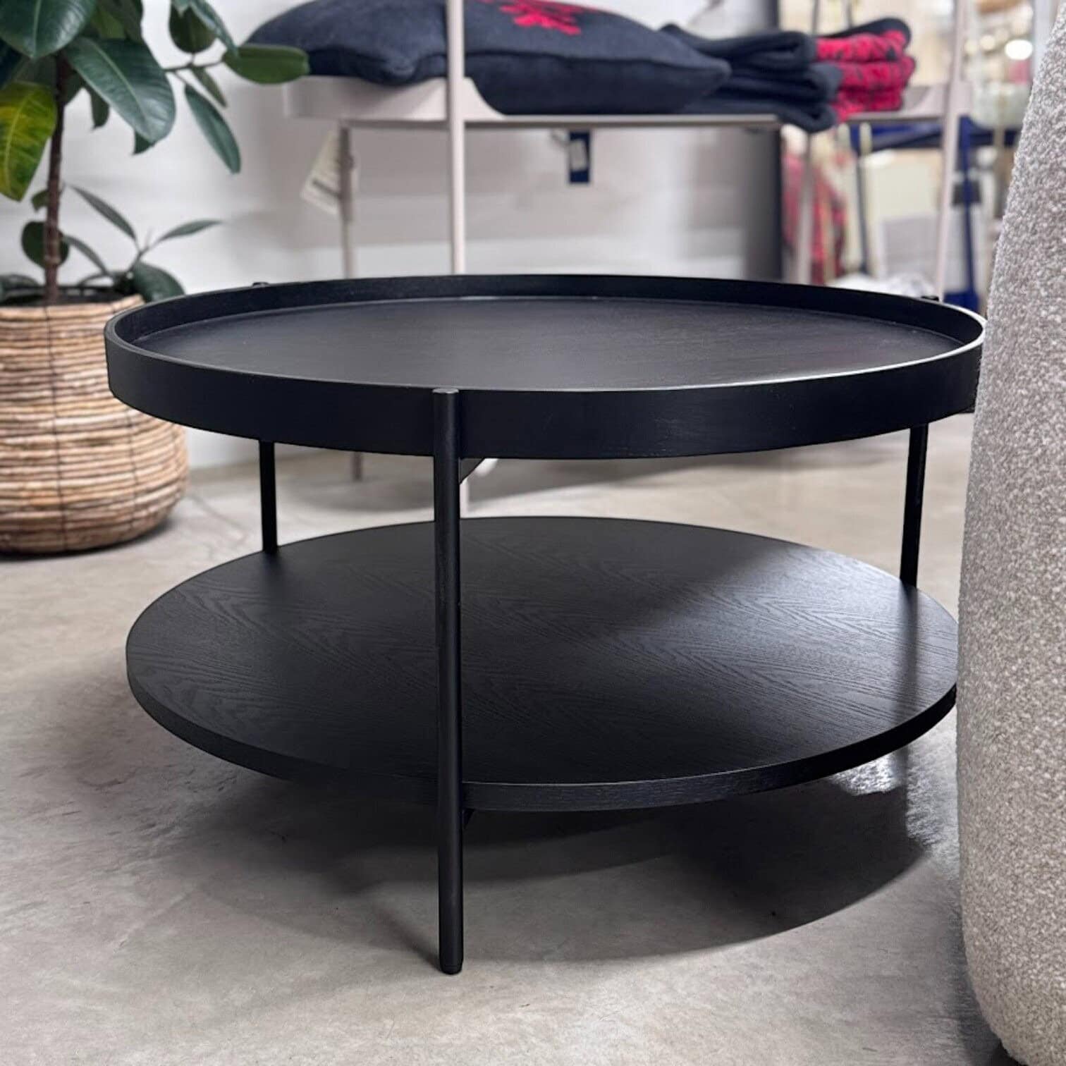 Galdiņš izceļas ar diviem līmeņiem, kas nodrošina papildu vietu žurnāliem, dekorācijām vai ikdienas lietām, padarot to par īpaši funkcionālu akcentu jebkurā atpūtas zonā. Apaļā forma piešķir telpai mīkstumu un vizuālu līdzsvaru, savukārt matēti melnais rāmis piešķir modernu noskaņu.