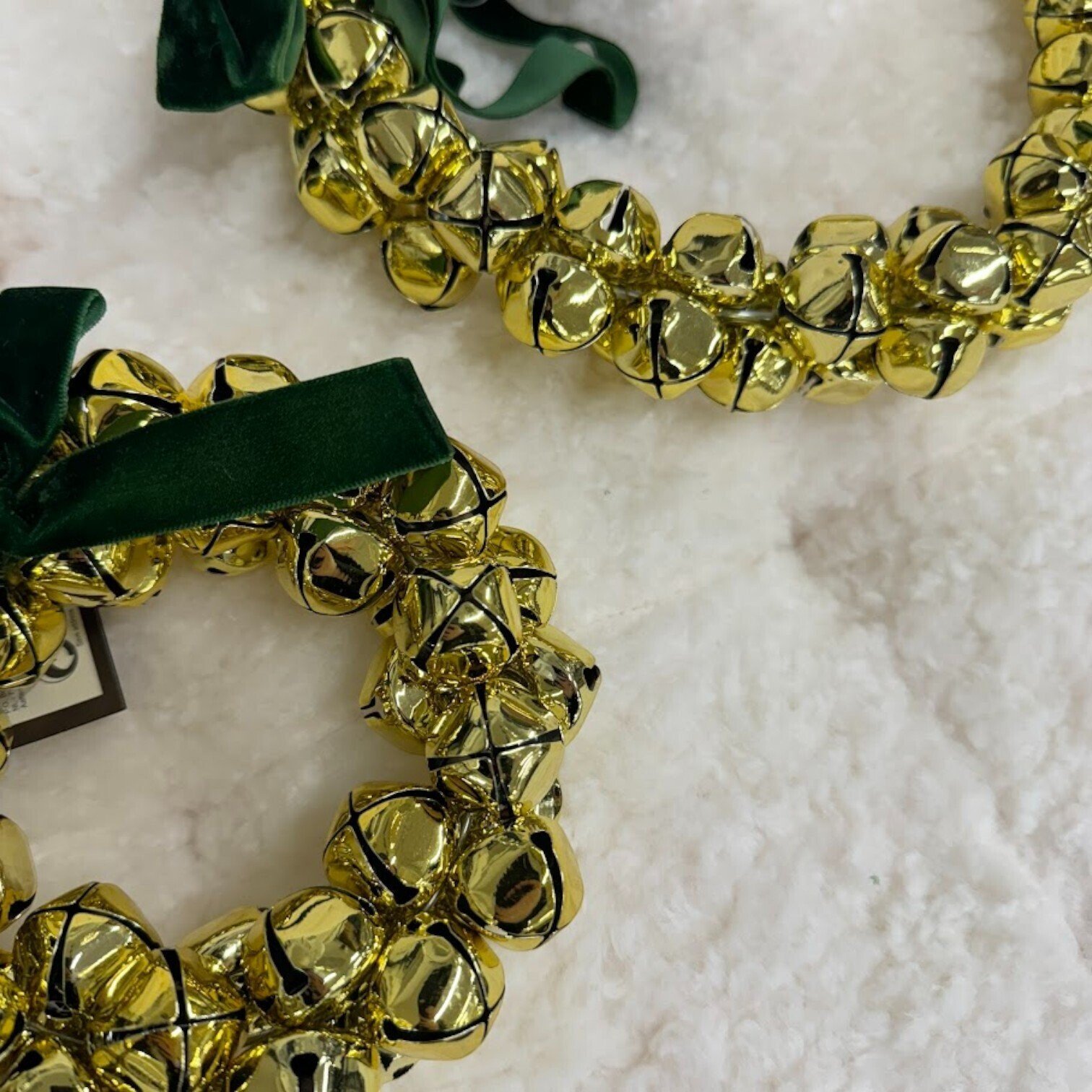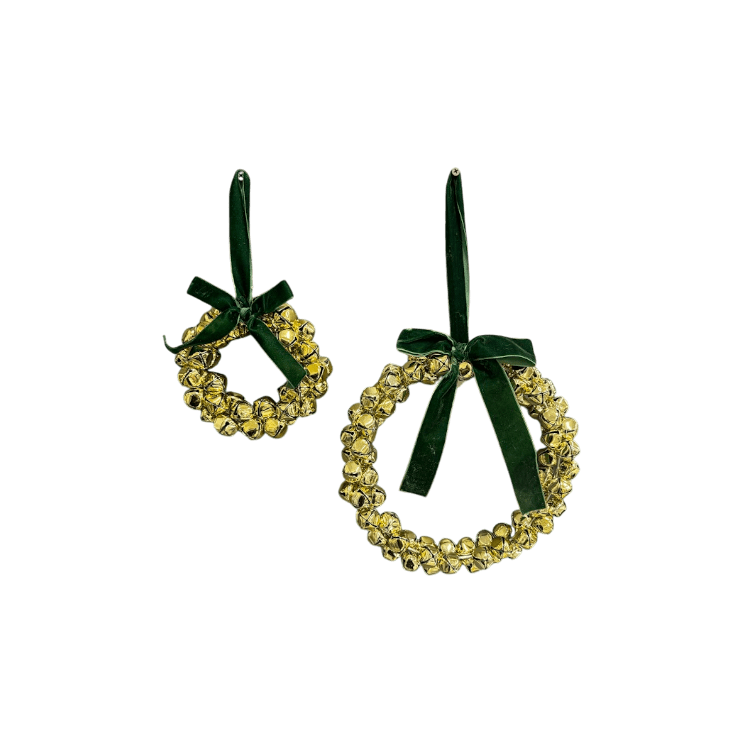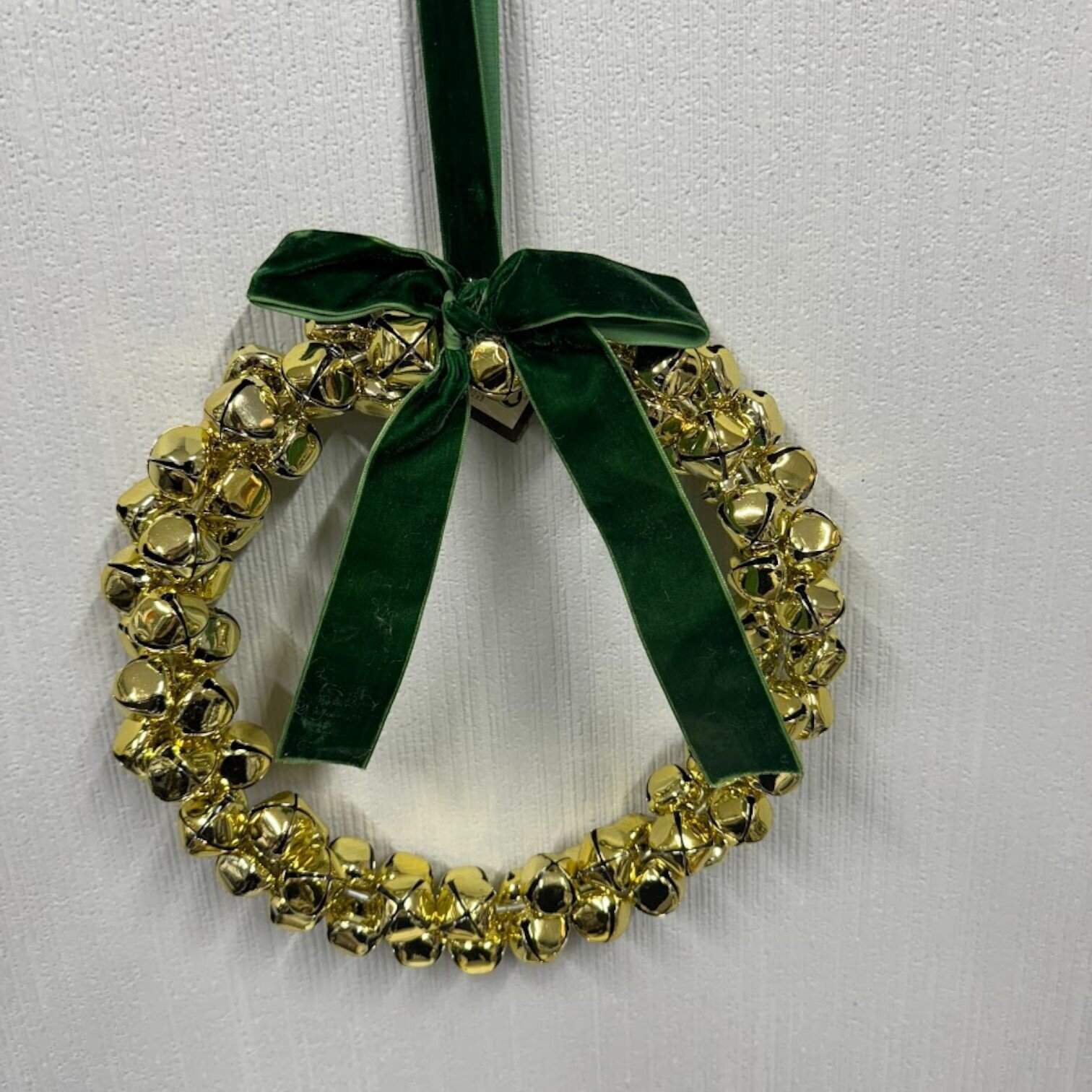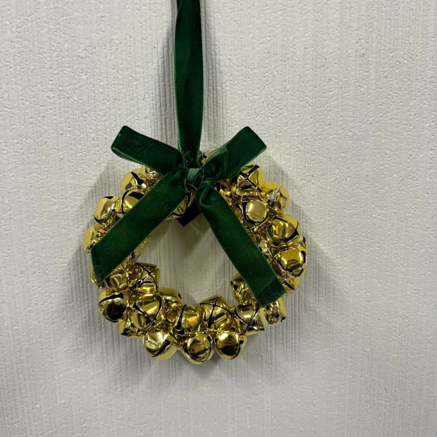 Šie svētku vainagu ornamenti ir uz stieples pamatnes izkārtoti zelta krāsas zvaniņi, kas apsieti ar zaļu lentes banti. Lieliski piemērots durvju un sienas dekorācijai. Neatkarīgi no tā, kur tie atradīsies, šie vainagi noteikti radīs svētku un mājīguma sajūtu.